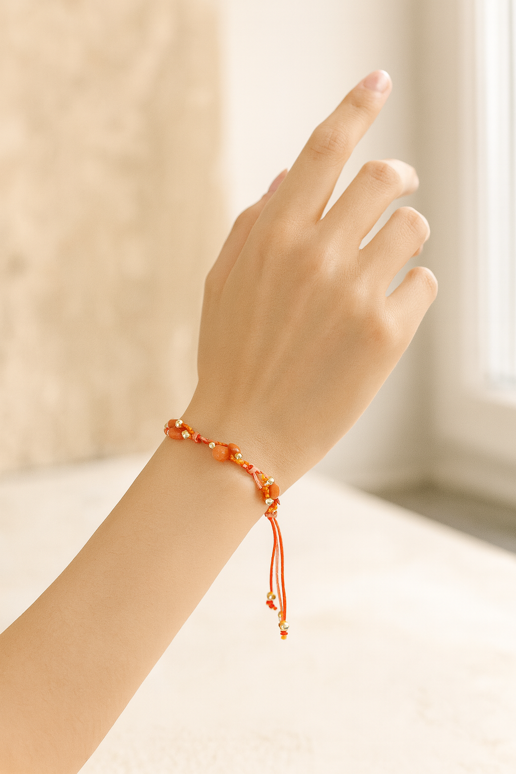 Doğal Akik taşının sade ve zarif görünümünü el işçiliği makrome örgü ile buluşturan bu bileklik, günlük stile kolayca uyum sağlayan zamansız bir tasarımdır. Ayarlanabilir düğüm yapısı sayesinde farklı bilek ölçülerine rahatça oturur; mat/parlak yüzeyi ve homojen boncuk dizilimiyle temiz, modern bir duruş sunar.