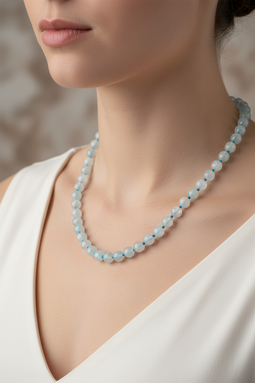 Akuamarin Doğal Taş Kolye – 8 mm Düğümlü, Unisex Tasarım
