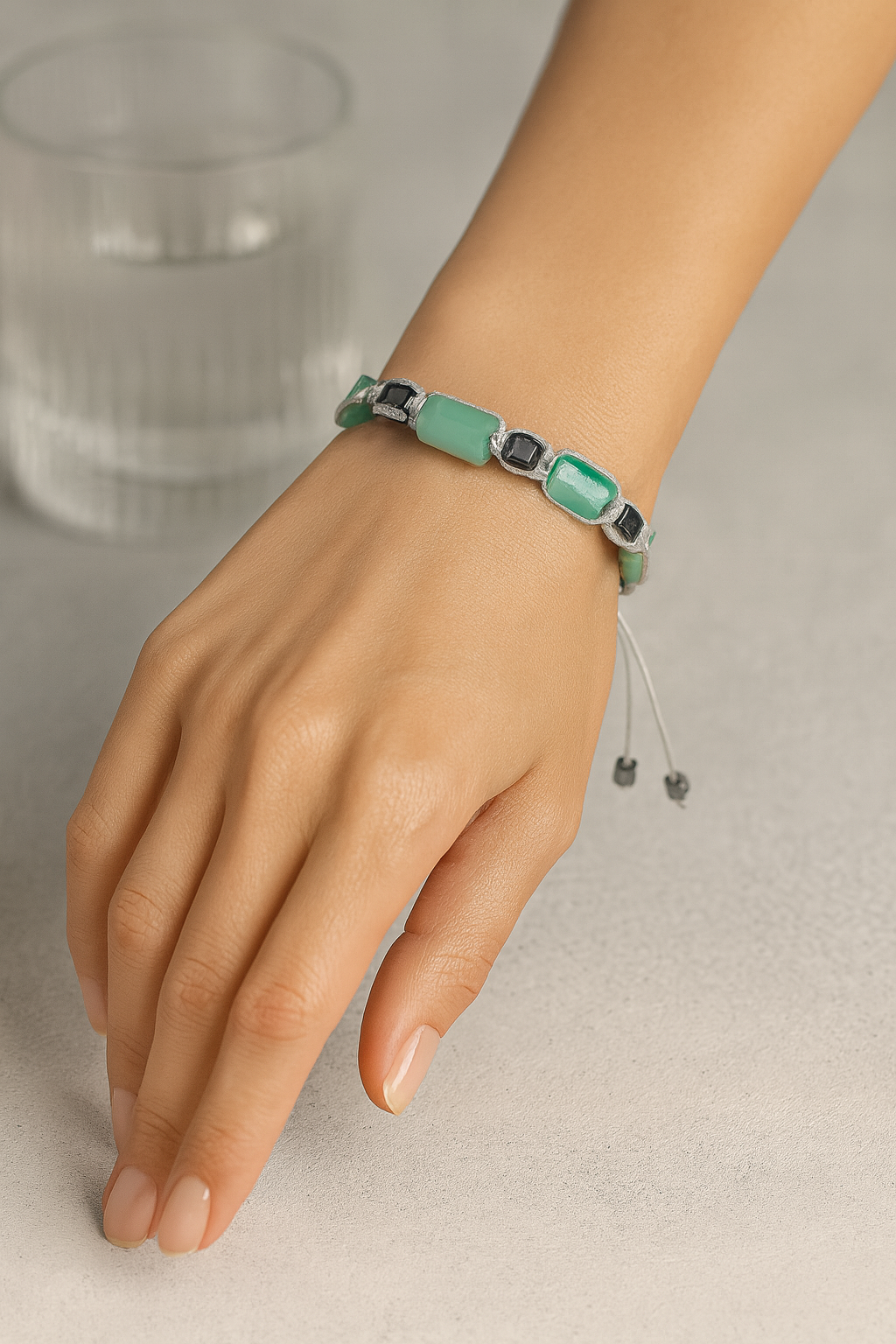 Doğal Amazonit taşı, mavi-yeşil tonlarıyla sakin bir görünüm sunarken; Aventurin taşı yeşilin farklı tonlarıyla bilekliğe doğal bir denge kazandırır. Renk geçişleri tamamen doğal olduğundan her bileklik kendine özgü bir karakter taşır. Günlük kullanıma uygun dayanıklı yapısıyla uzun ömürlü bir kullanım sağlar.