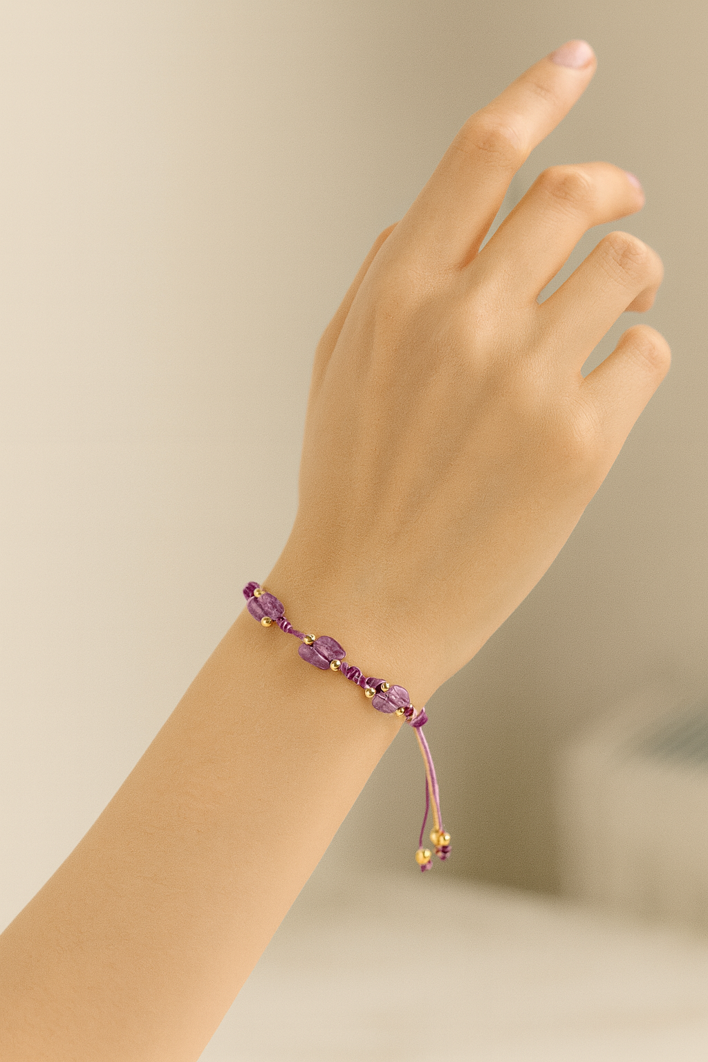 Doğal ametist taşlarının zarif mor tonlarıyla tasarlanan bu makrome bileklik, sade ve modern çizgisiyle her stile uyum sağlar. El işçiliğiyle örülmüş dayanıklı makrome örgüsü sayesinde uzun ömürlü bir kullanım sunar. Ayarlanabilir yapısı farklı bilek ölçülerine kolayca uyum sağlar. Lüks detayları ve minimalist formuyla hem günlük kullanıma hem de özel günlerde şık bir tamamlayıcı olarak idealdir.