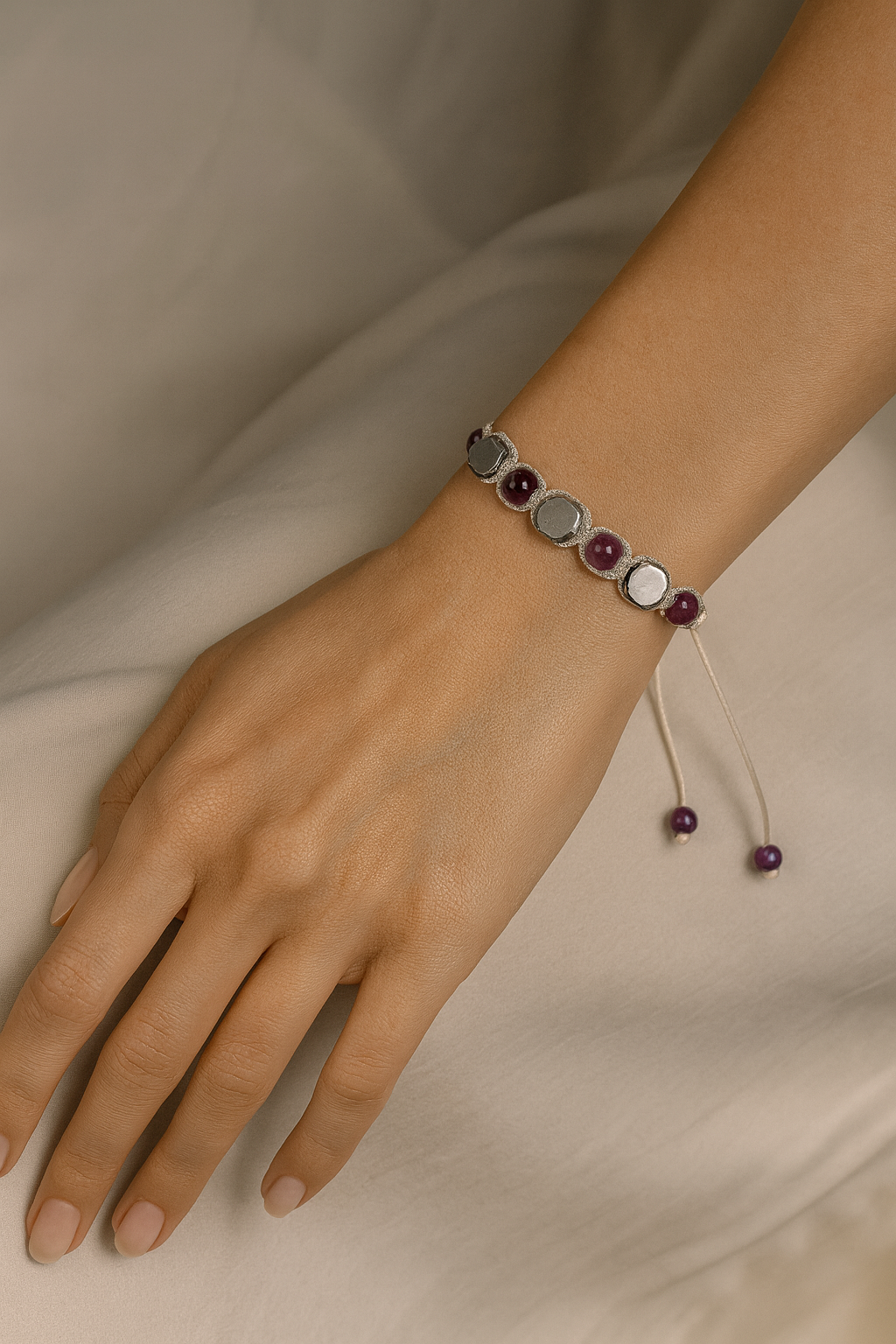Ametistin doğal mor tonları, ışığa göre değişen etkileyici bir derinlik sunarken; hematit taşının gri metalik yansımaları bilekliğe modern bir dokunuş kazandırır. El işçiliğiyle örülen makrome ip, uzun süreli kullanım için sağlam ve konforludur.