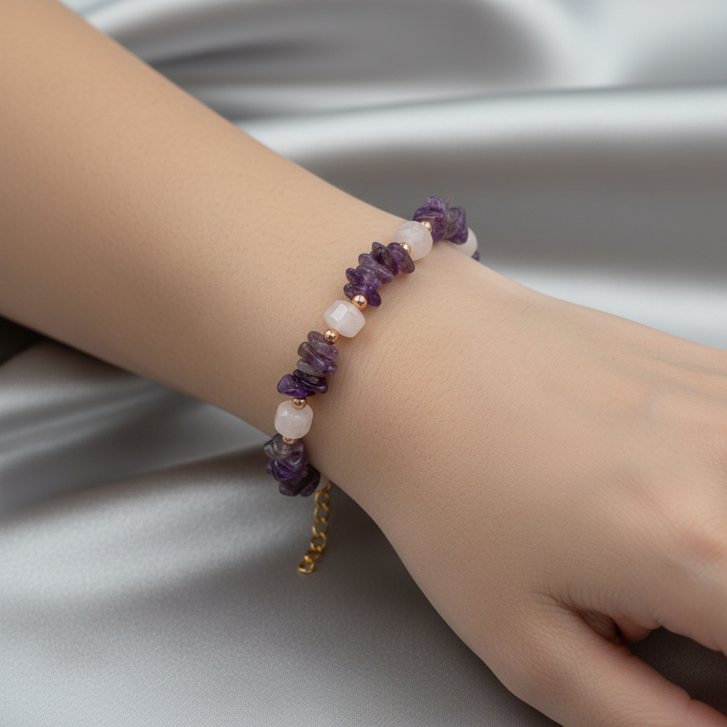Ay taşının gizemli parıltısı ile ametistin mor zarafeti, altın kaplama detaylarla birleşerek zarif bir bileklik tasarımına dönüşüyor. El işçiliğiyle özenle hazırlanmış bu özel parça; günlük kombinlerde şıklık katarken, özel günlerde de sofistike bir tamamlayıcıdır. Doğal taşların uyumu, tasarıma hem romantik hem de modern bir karakter kazandırır.