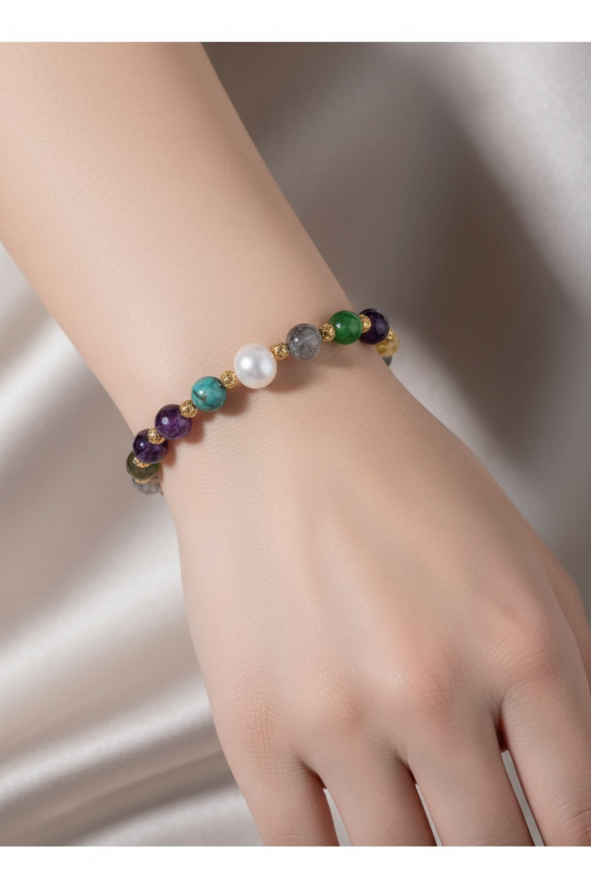 Ametistin asaleti, bronzit ve labradoritin sofistike yansımaları, incinin zarafeti, kehribarın sıcaklığı, krizokolun benzersiz desenleri ve aventurinin huzurlu yeşiliyle birleşen bu bileklik; koleksiyonuna şık, modern ve anlamlı bir parça eklemek isteyenler için ideal seçimdir.