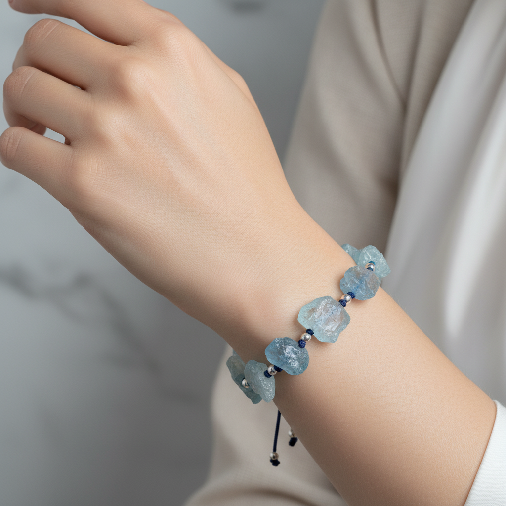 Doğal akuamarin taşlarıyla tasarlanan bu makrome bileklik, zarif ve modern görünümüyle öne çıkar. El işçiliğiyle özenle örülen dayanıklı makrome örgü, günlük kullanımda ve özel günlerde şıklığınızı tamamlayan estetik bir aksesuardır.