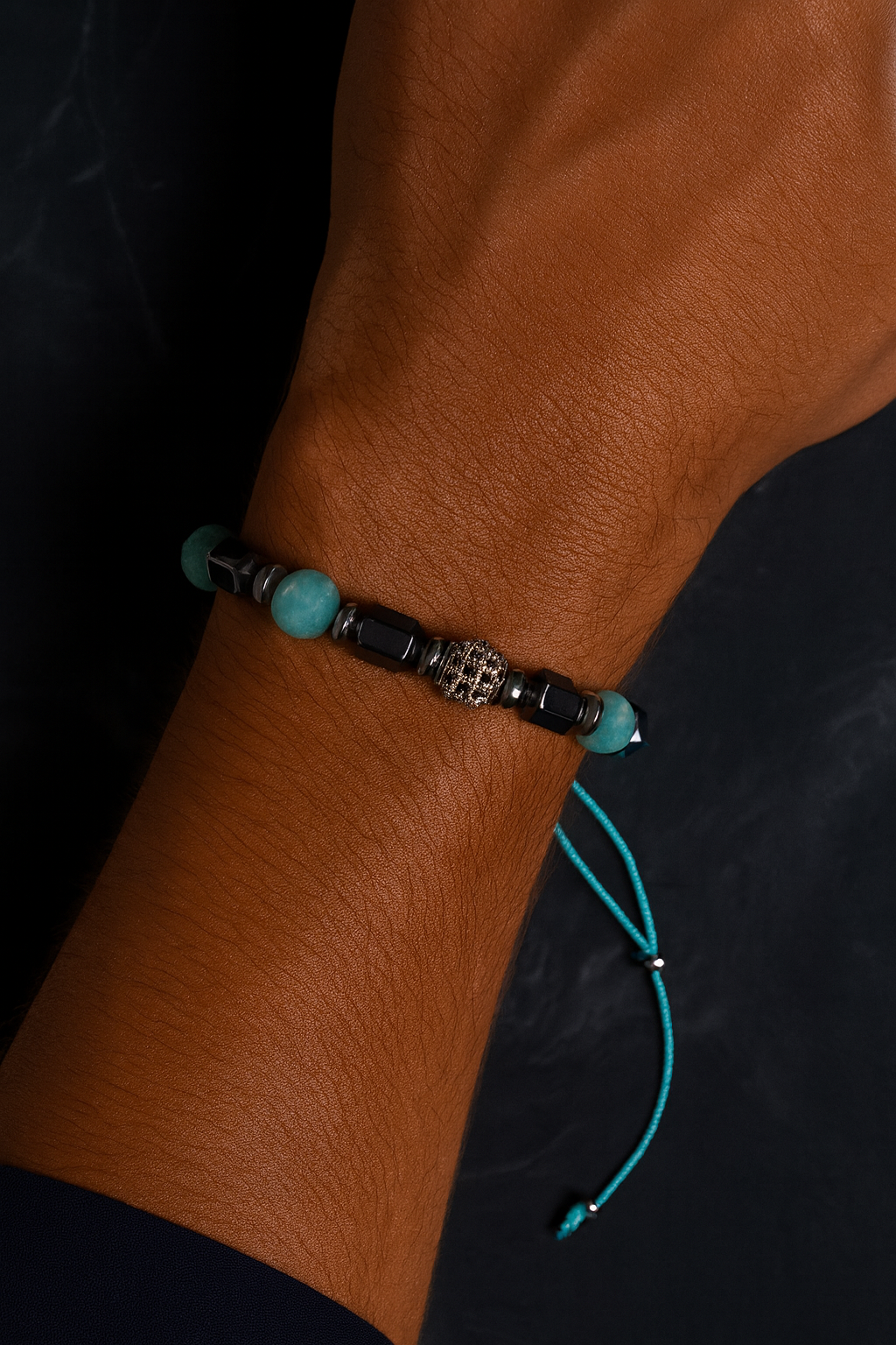 Amazonit taşının turkuaz tonlarındaki doğal canlılığı, hematitin metalik gri parlaklığıyla birleşerek modern ve şık bir bileklik tasarımı ortaya çıkarıyor. El işçiliğiyle örülen makrome yapısı bileğe kolayca uyum sağlar ve ayarlanabilir özelliği sayesinde farklı ölçülere rahatlıkla takılabilir.