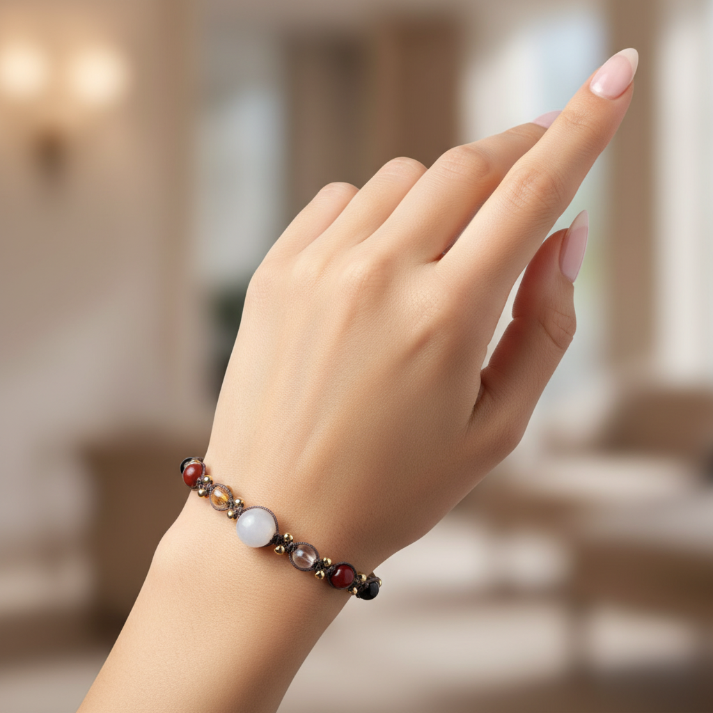 Akrep burcuna özel olarak tasarlanan bu doğal taş makrome bileklik, şık ve modern görünümüyle günlük kombinlere zarif bir dokunuş katar. El işçiliğiyle özenle örülen dayanıklı makrome örgü, uzun süreli kullanım ve konforlu bir yapı sunar.