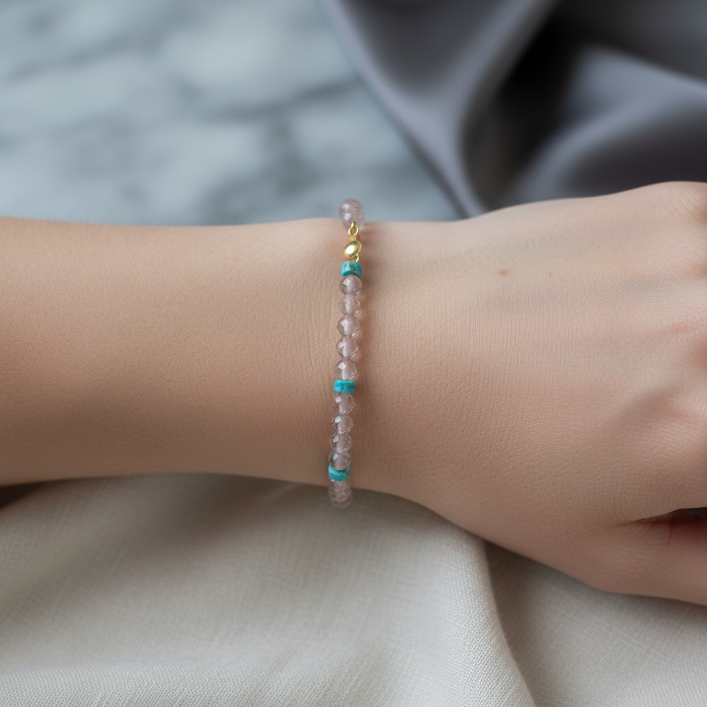 Dumanlı kuvars ve turkuaz taşlarının uyumuyla tasarlanan bu doğal taş bileklik, modern ve şık görünümüyle öne çıkar. El işçiliğiyle özenle hazırlanmış olan tasarım, günlük kullanımda ve özel günlerde stilinizi tamamlayan estetik bir aksesuardır.
