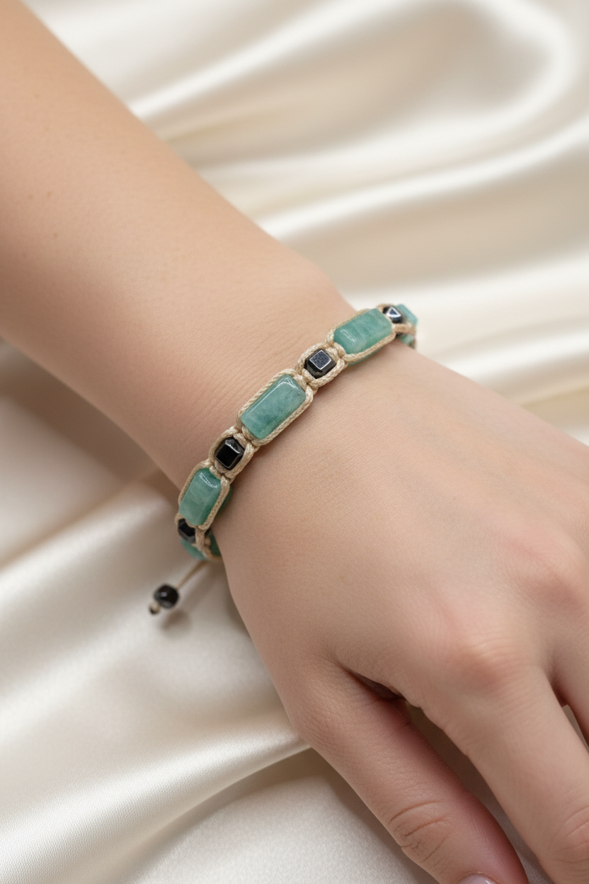 Amazonit taşının canlı turkuaz tonları ile hematitin metalik gri parlaklığı bu bileklikte modern ve zarif bir uyum oluşturuyor. Köşeli makrome modeliyle örülen ipli tasarım, dayanıklı yapısı ve ayarlanabilir formu sayesinde farklı bilek ölçülerine kolayca uyum sağlar. Günlük kombinlerde doğal bir şıklık, özel günlerde ise sofistike bir tamamlayıcı aksesuar olarak öne çıkar.