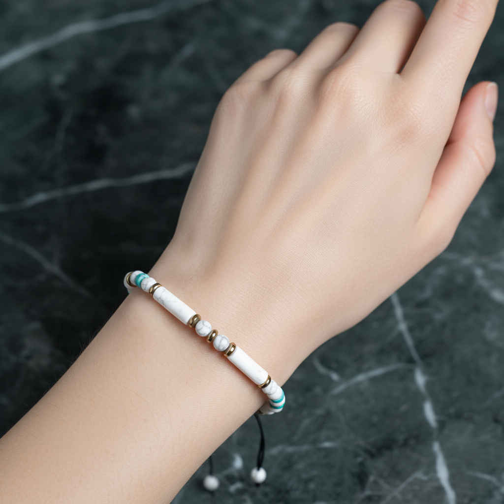 Havlit, turkuaz ve hematit taşlarının uyumuyla tasarlanan bu doğal taş makrome bileklik, modern ve zarif görünümüyle öne çıkar. El işçiliğiyle özenle örülen dayanıklı makrome örgü, günlük kullanımda ve özel günlerde şıklığınızı tamamlayan estetik bir aksesuardır.