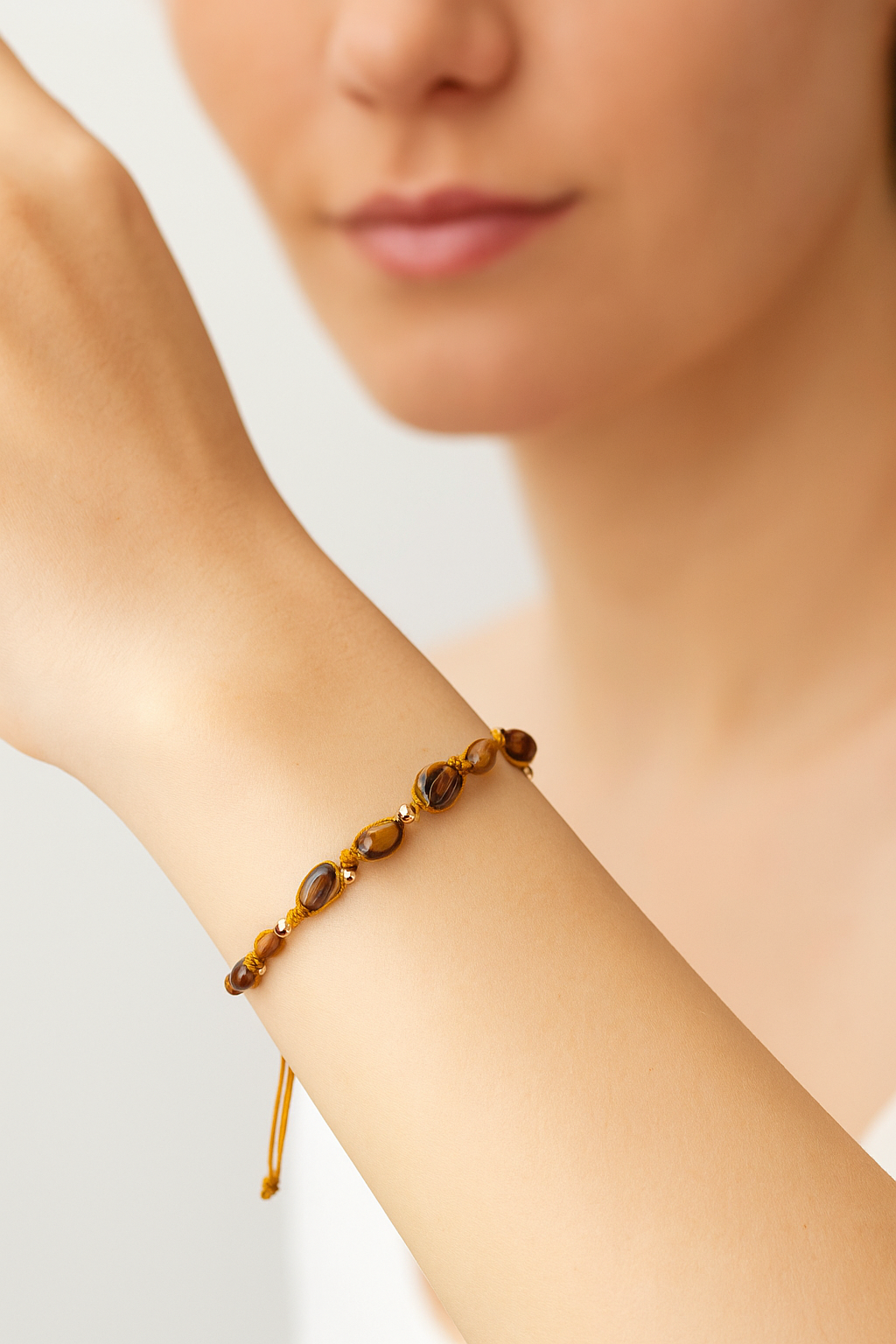 Işığa göre değişen altın kahverengi yansımaları ve ipeksi çizgileriyle tanınan kaplan gözü taşı, bu özel bileklikte natürel (ham formuna yakın) kesimiyle sunulmuştur. Her taş, doğadaki özgün formunu koruyarak el yapımı ayarlanabilir makrome örgüyle birleştirilmiştir.