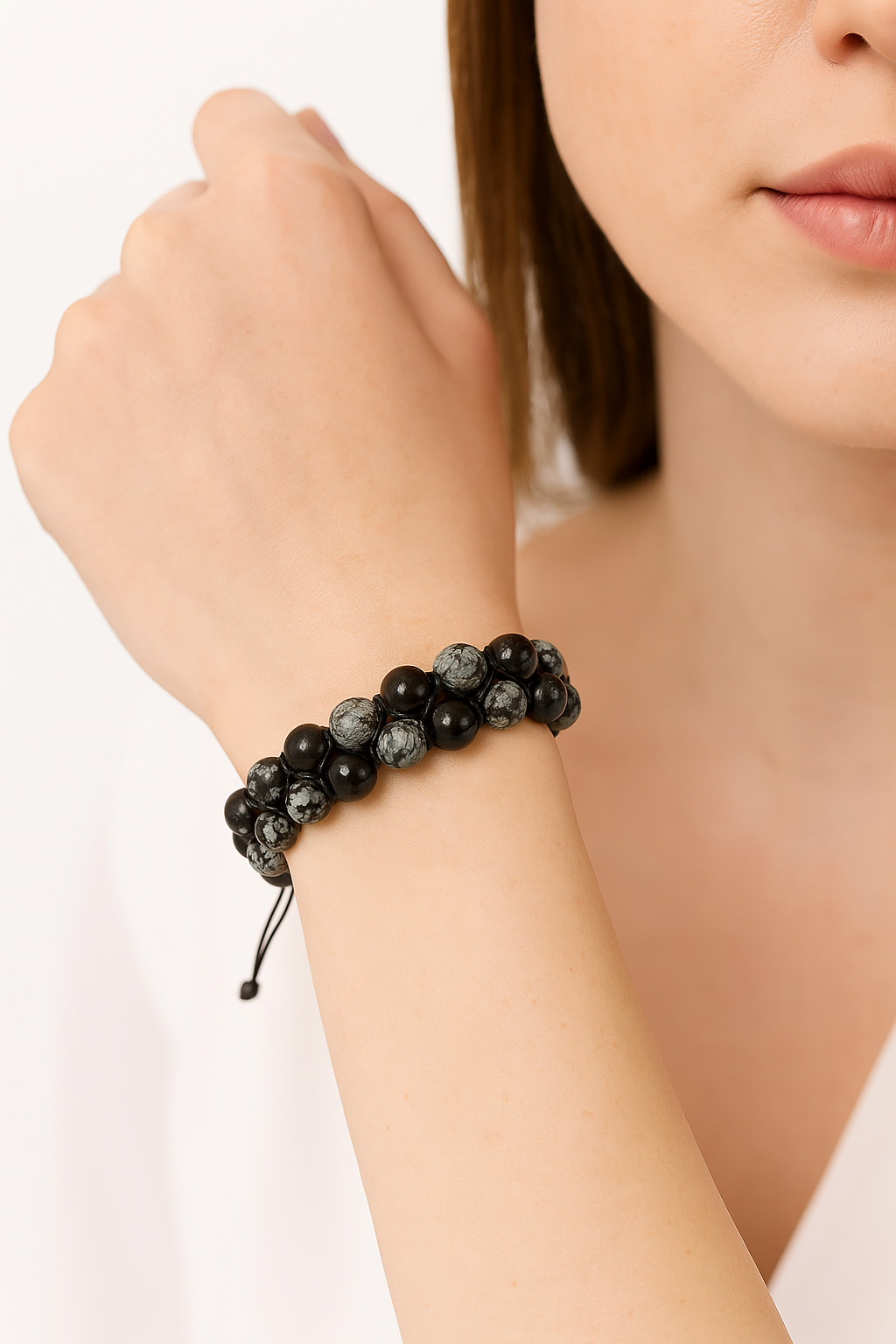 Siyah zemin üzerinde kar tanelerini andıran gri-beyaz desenleriyle tanınan karlı obsidyen taşı, bu özel bileklikte 8 mm yuvarlak kesim formuyla hazırlanmış ve çift sıra el yapımı makrome örgü ile tamamlanmıştır. Hem sade hem de özgün yapısıyla bilekte güçlü ve dengeli bir duruş sunar.