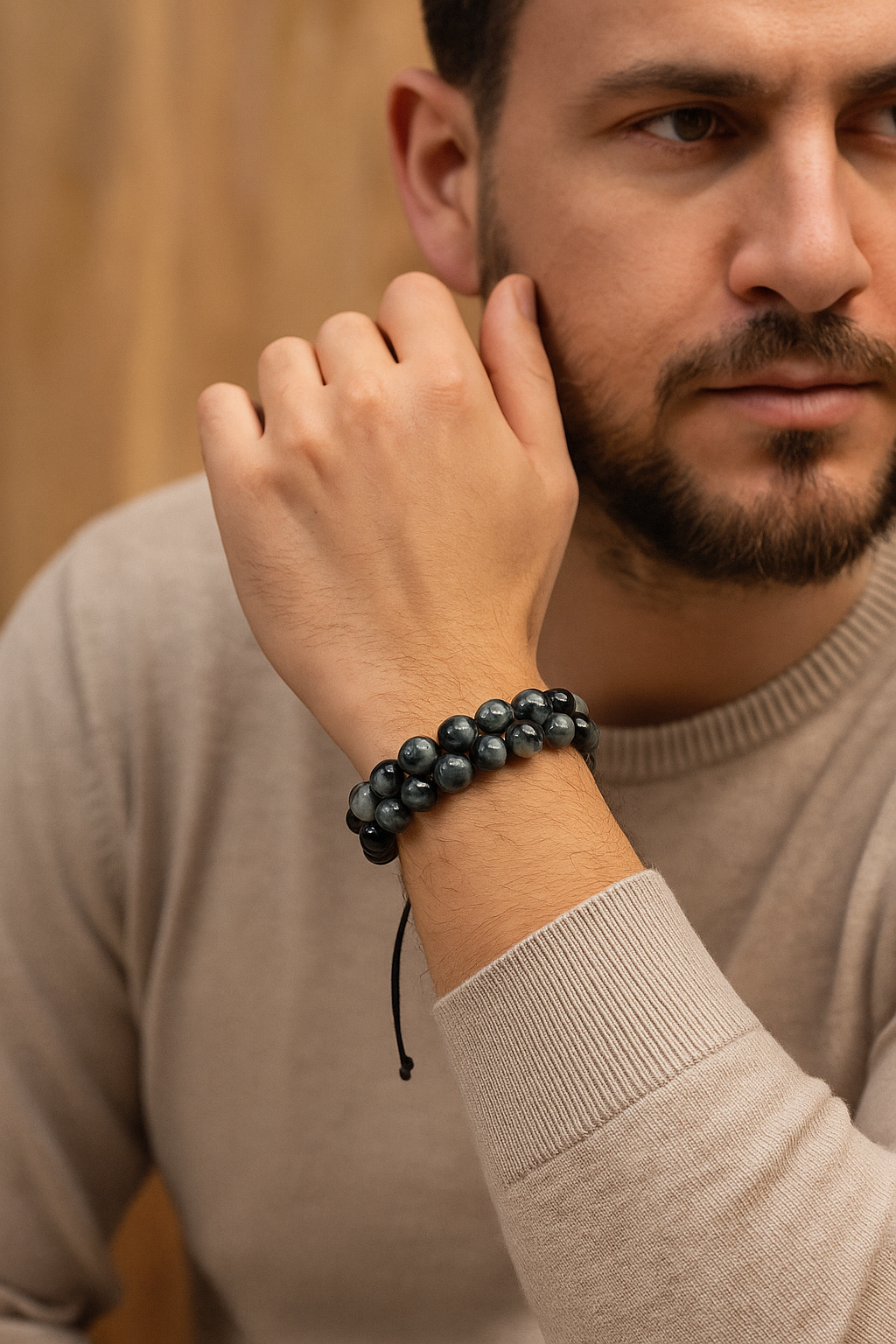 Işığa göre hareket eden çizgisel yansımaları ve cam parlaklığıyla tanınan kedi gözü taşı, bu özel bileklikte 8 mm yuvarlak kesim formunda dizilmiş ve çift sıra el yapımı makrome örgü ile tamamlanmıştır. Taşların ipeksi ışık oyunları, bilekte dikkat çekici ve modern bir duruş sunar.