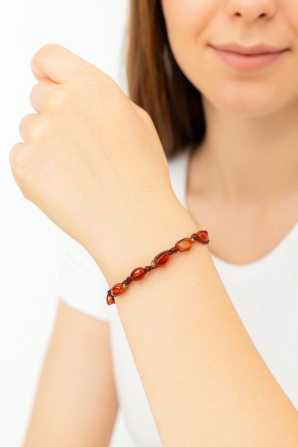 Toprakla bütünleşen sıcak kırmızı ve kahverengi tonlarıyla öne çıkan kırmızı akik taşı, bu özel bileklikte natürel kesimiyle yani ham yapısına yakın formda işlenerek sunulmuştur. Doğal dokusu korunarak dizilen taşlar, el yapımı ayarlanabilir makrome örgü ile zarif ve dayanıklı bir forma kavuşur.