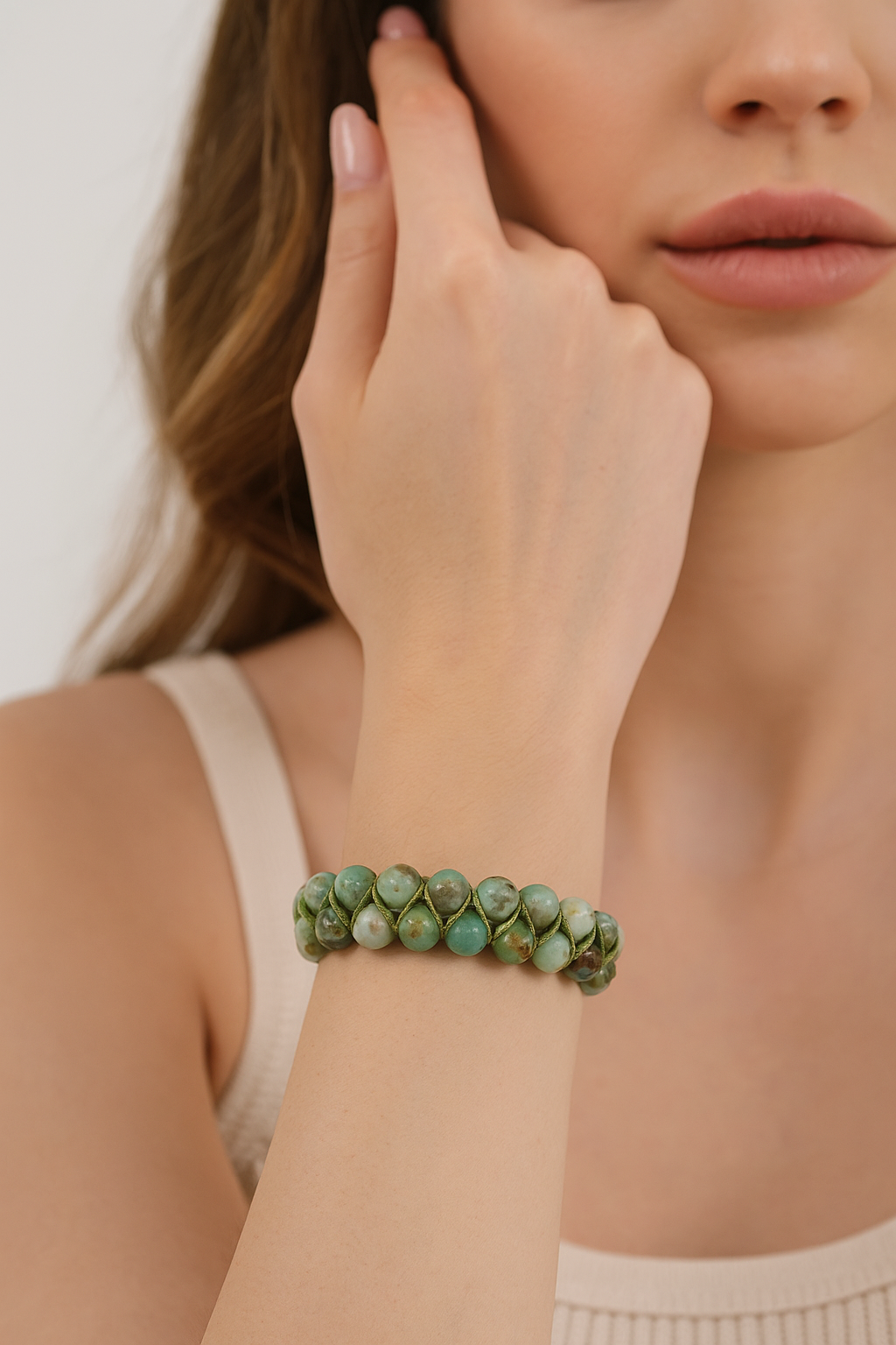 Doğal elma yeşili tonları ve yarı saydam yapısıyla öne çıkan krizopras taşı, bu özel bileklikte 8 mm yuvarlak kesim formunda dizilmiş ve çift sıra el yapımı makrome örgü ile tamamlanmıştır. Canlı rengi ve zarif duruşuyla bilekte hem enerjik hem de sofistike bir görünüm sunar.