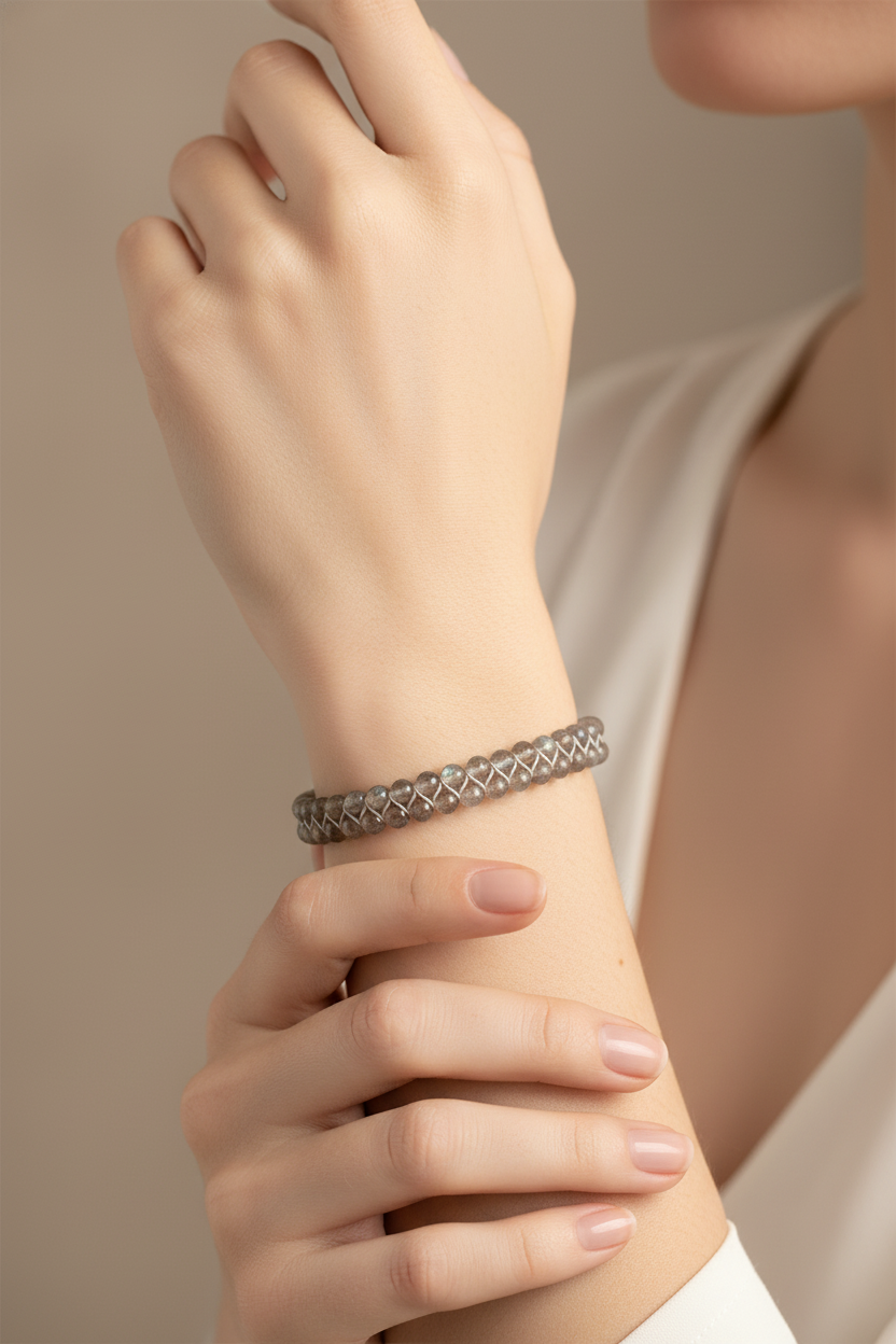 Pirtash ile labradorit taşının eşsiz ışık oyunlarını, çift sıra makrome tasarımın modern şıklığı ve bilimsel güvenceyle bileğinizde taşıyın.
