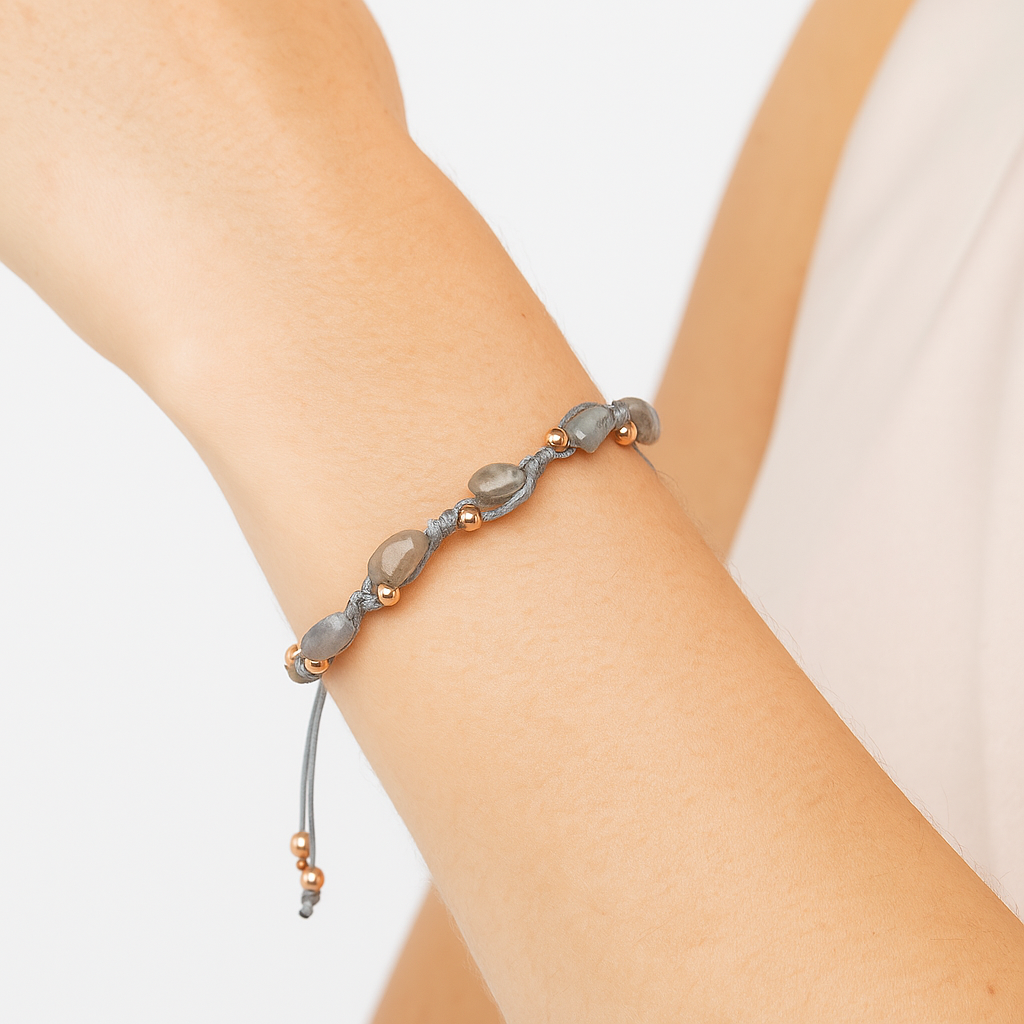 Doğal gri tabanı üzerinde mavi, yeşil ve altın tonlarında ışıltılar yansıtan labradorit taşı, bu özel bileklikte natürel (ham formuna yakın) kesimiyle sunulmuştur. Taşların her biri doğadan geldiği haliyle işlenmiş; el yapımı ayarlanabilir makrome ip ile zarif bir uyum içinde birleştirilmiştir.