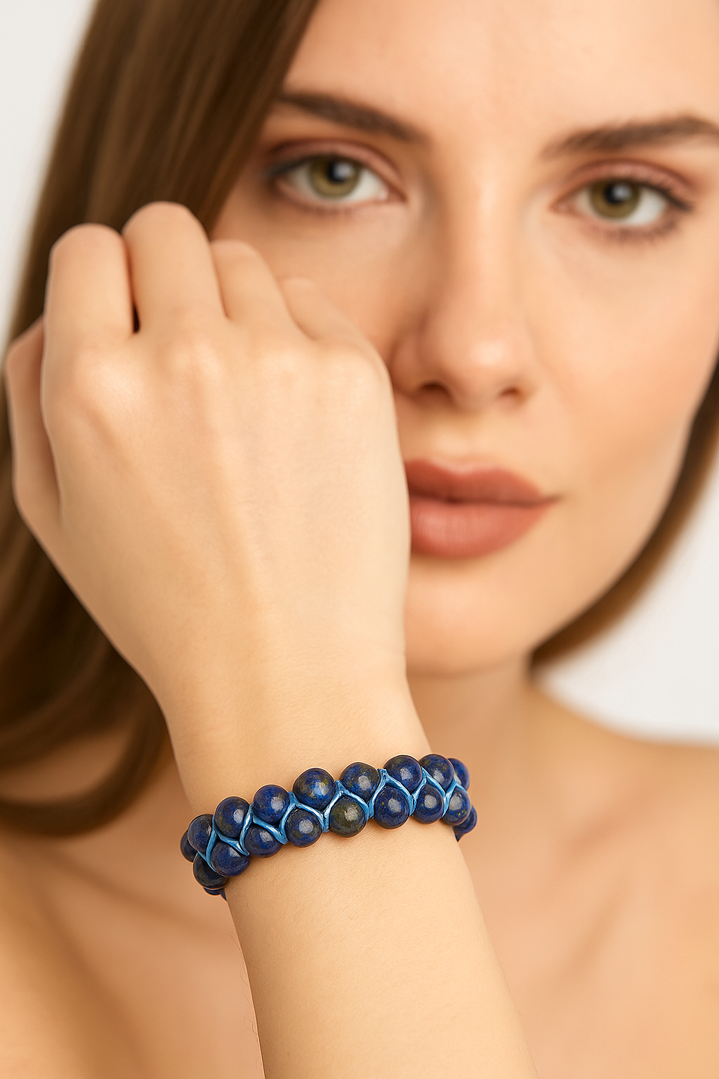 Derin lacivert tonu, içindeki altın pirit ışıltıları ve doğal beyaz damarlarıyla dikkat çeken lapis lazuli taşı, bu özel bileklikte 8 mm yuvarlak kesim formunda dizilmiş ve çift sıra el yapımı makrome örgü ile tamamlanmıştır. Doğal taşın asil görünümü, bilekte güçlü ve sofistike bir duruş sunar.