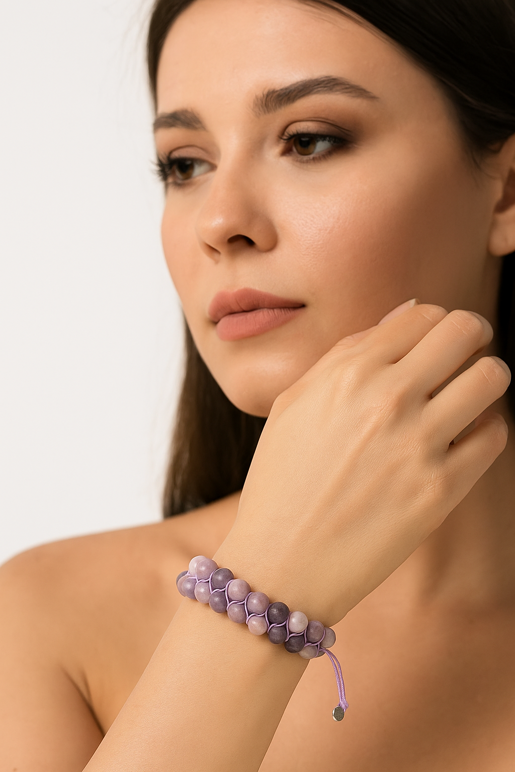 Lila, lavanta ve gri tonlarının ışıltılı birleşimini taşıyan lepidolit taşı, bu özel bileklikte 8 mm yuvarlak kesim formunda dizilmiş ve çift sıra el yapımı makrome örgü ile tamamlanmıştır. Taşın kendine özgü sedefli parlaklığı ve yumuşak renk geçişleri, bilekte zarif ve dengeli bir duruş sunar.