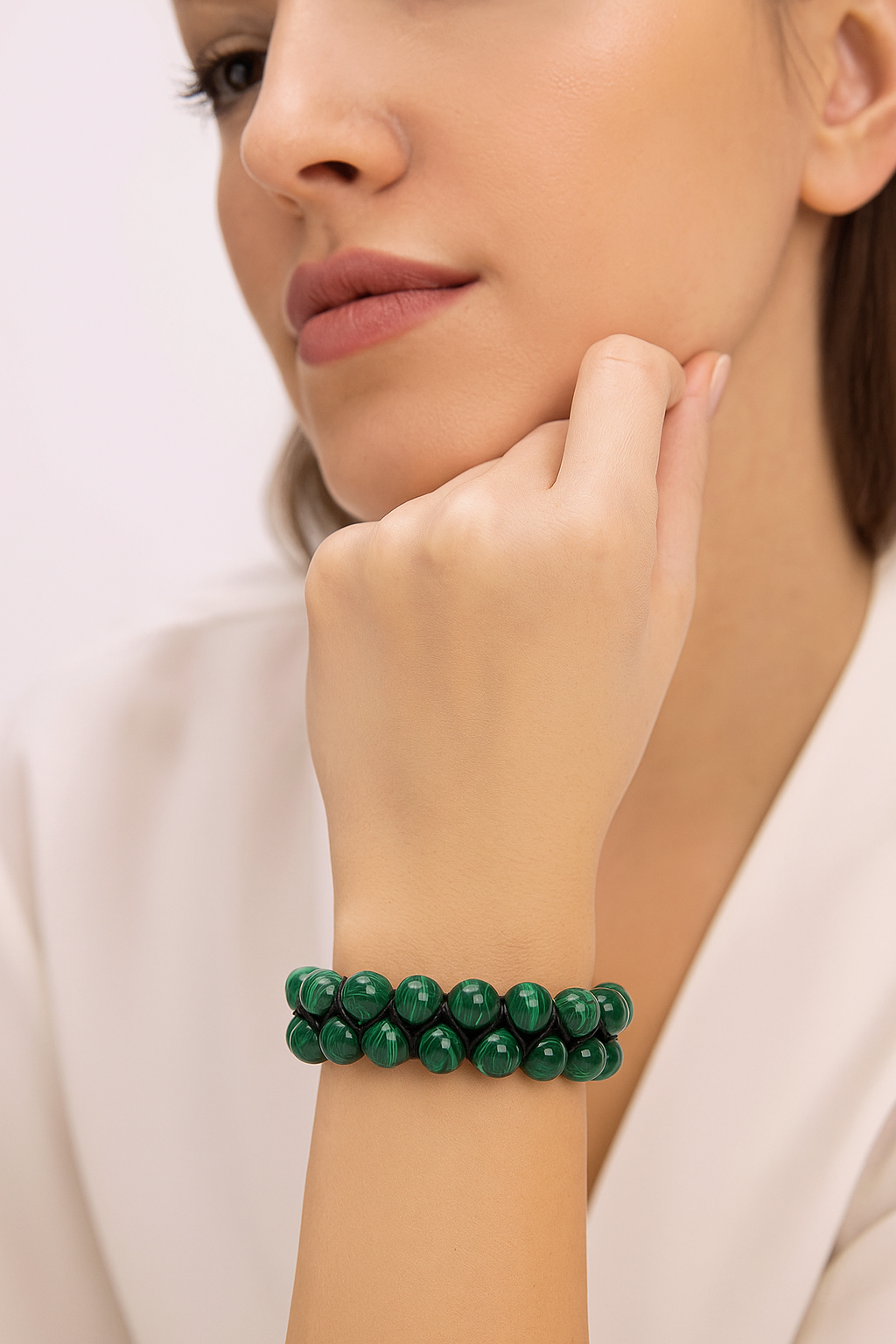 Malakit taşlarının her biri kendine özgü çizgisel desenleri ve derin renk geçişleriyle eşsizdir. Çift sıra dizilim, bu zengin doğal detayları daha belirgin ve hacimli bir biçimde sergiler. Doğal taş tutkunları için hem şık hem de güçlü bir bileklik alternatifidir.