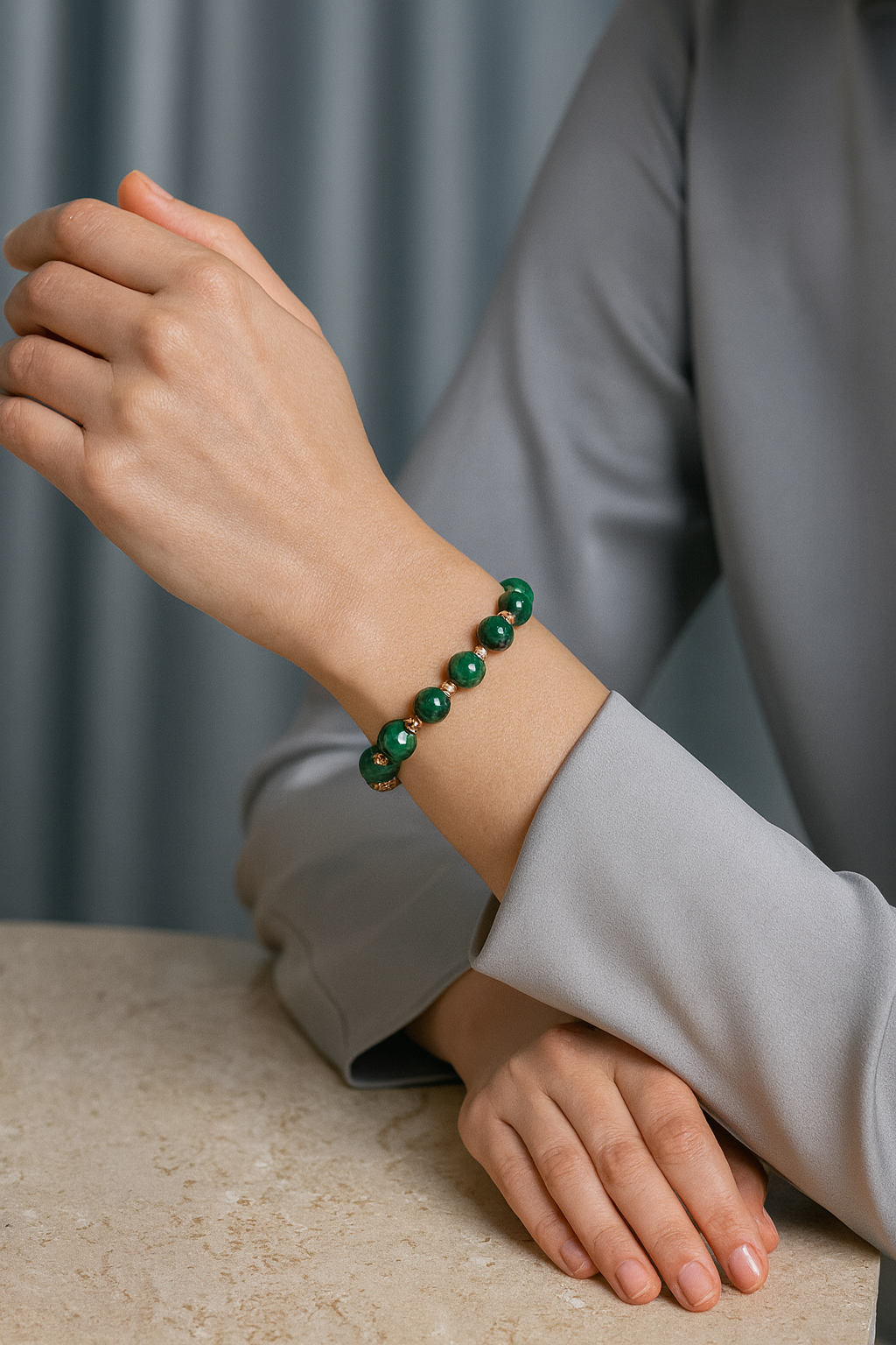 Pirtash ile malakit taşının doğal yeşil desenlerini, hematitin modern parlaklığıyla ve bilimsel güvenceyle bileğinizde taşıyın.