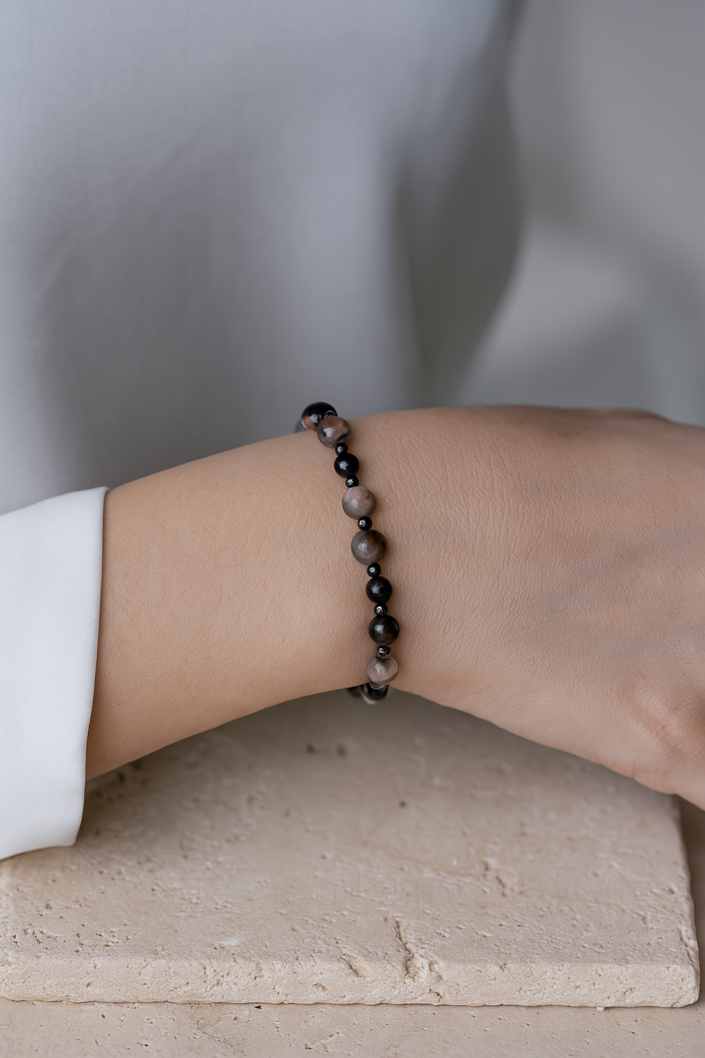 Her taş %100 doğaldır ve her bileklik, sipariş üzerine özel olarak tek tek üretilir. Obsidyenin mat-siyah dokusu, Botswana akikin gri-bej tonlarıyla modern ve sofistike bir uyum yakalar.