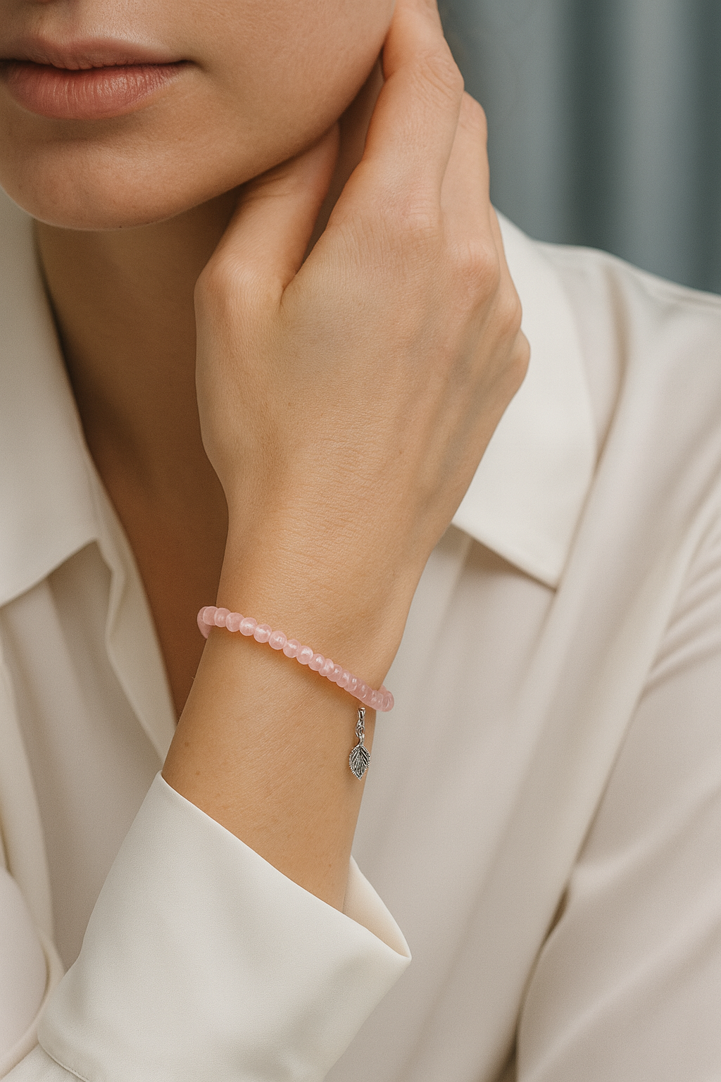 Yumuşak ve doğal pembe tonlarıyla dikkat çeken pembe kuvars taşı, 925 ayar saf gümüş detaylarla buluşarak sade ve zarif bir bilekliğe dönüşüyor.