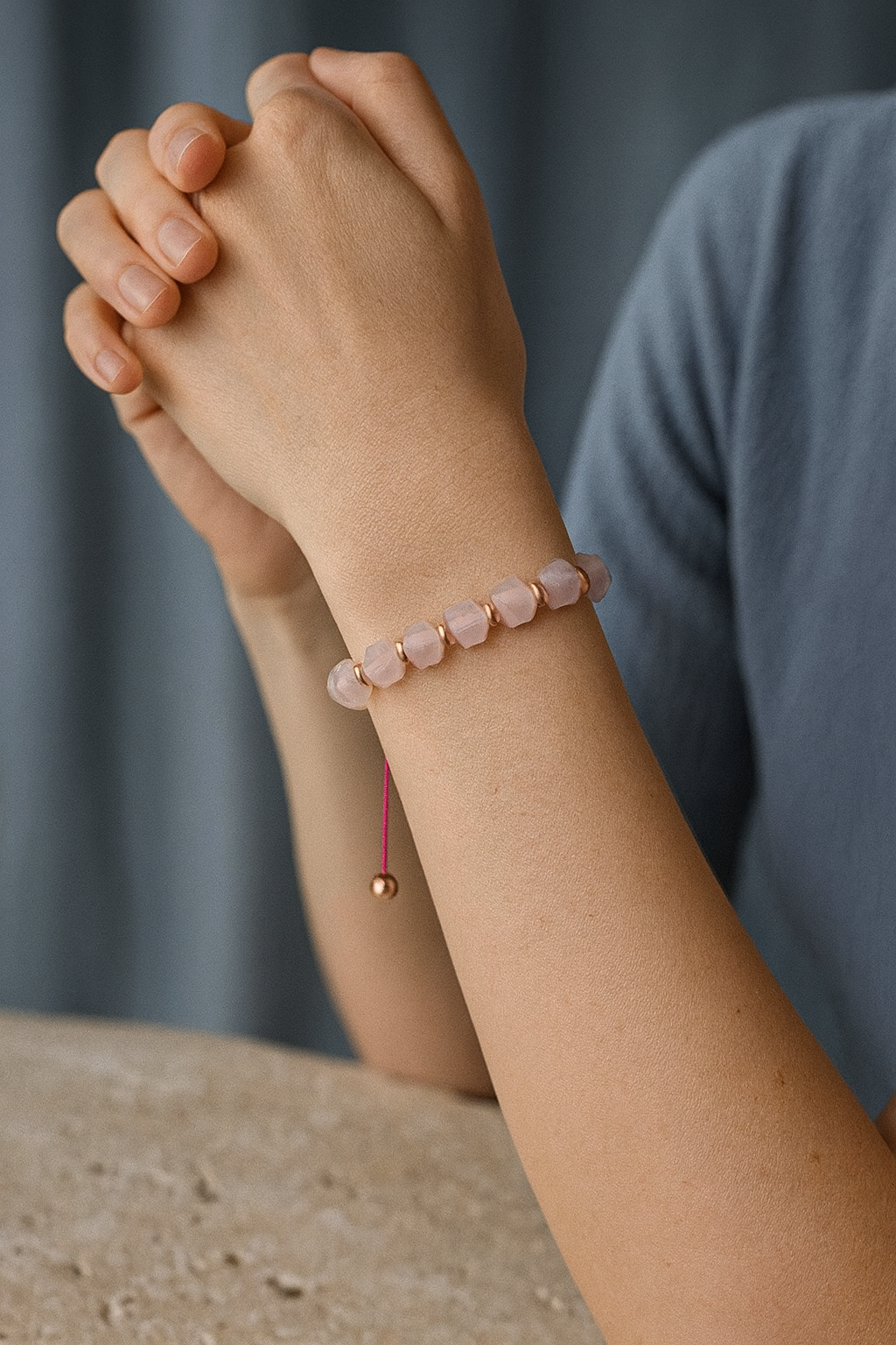 Yumuşak tonları ve doğal saydamlığıyla dikkat çeken pembe kuvars taşı, bu özel tasarım bileklikte modern hexagonal (altıgen) kesim formuyla zarif bir stil sunuyor.