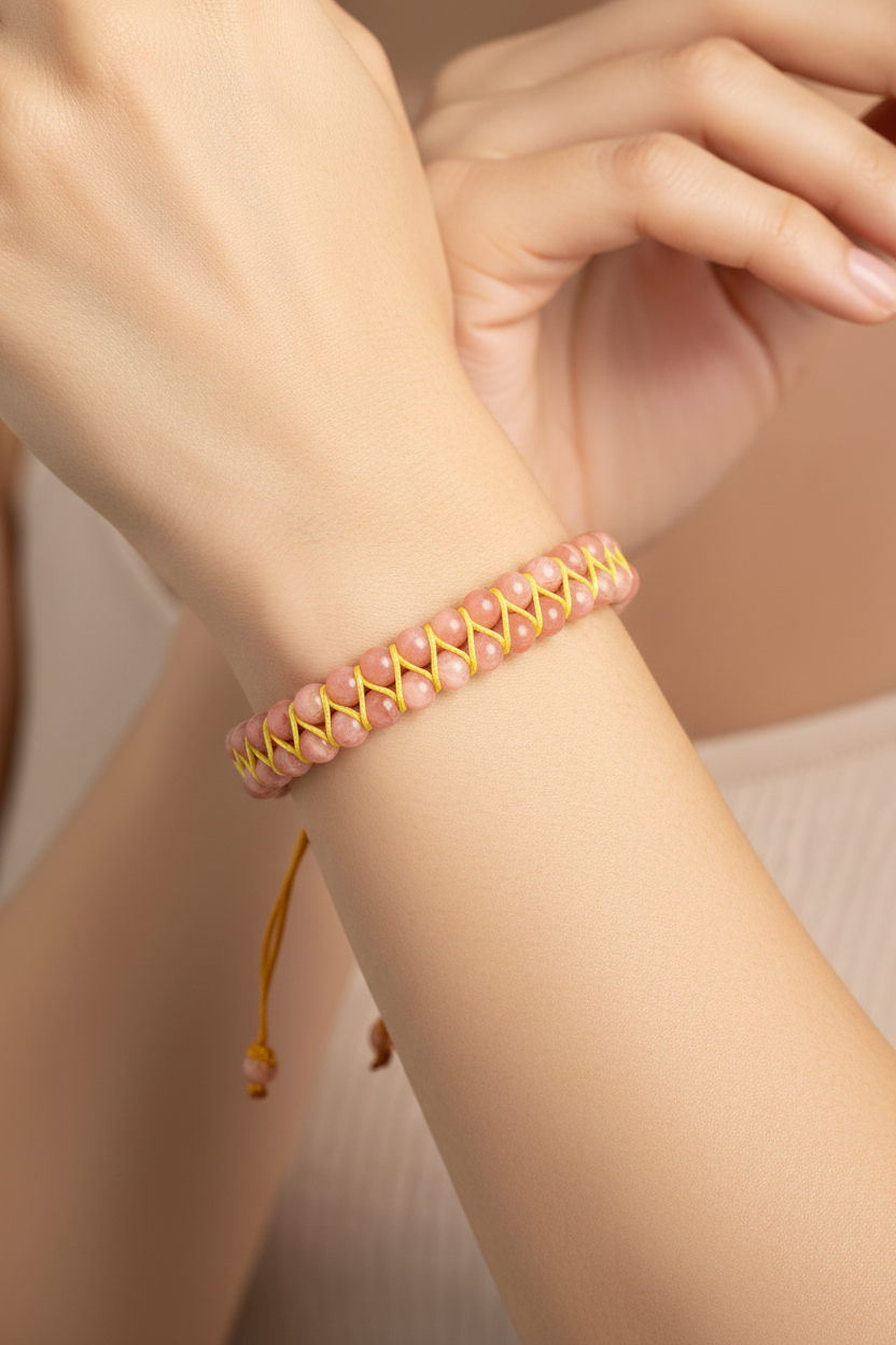 Pirtash ile rodokrozit taşının zarif pembe tonlarını, çift sıra makrome şıklığı ve bilimsel güvenceyle bileğinizde taşıyın.