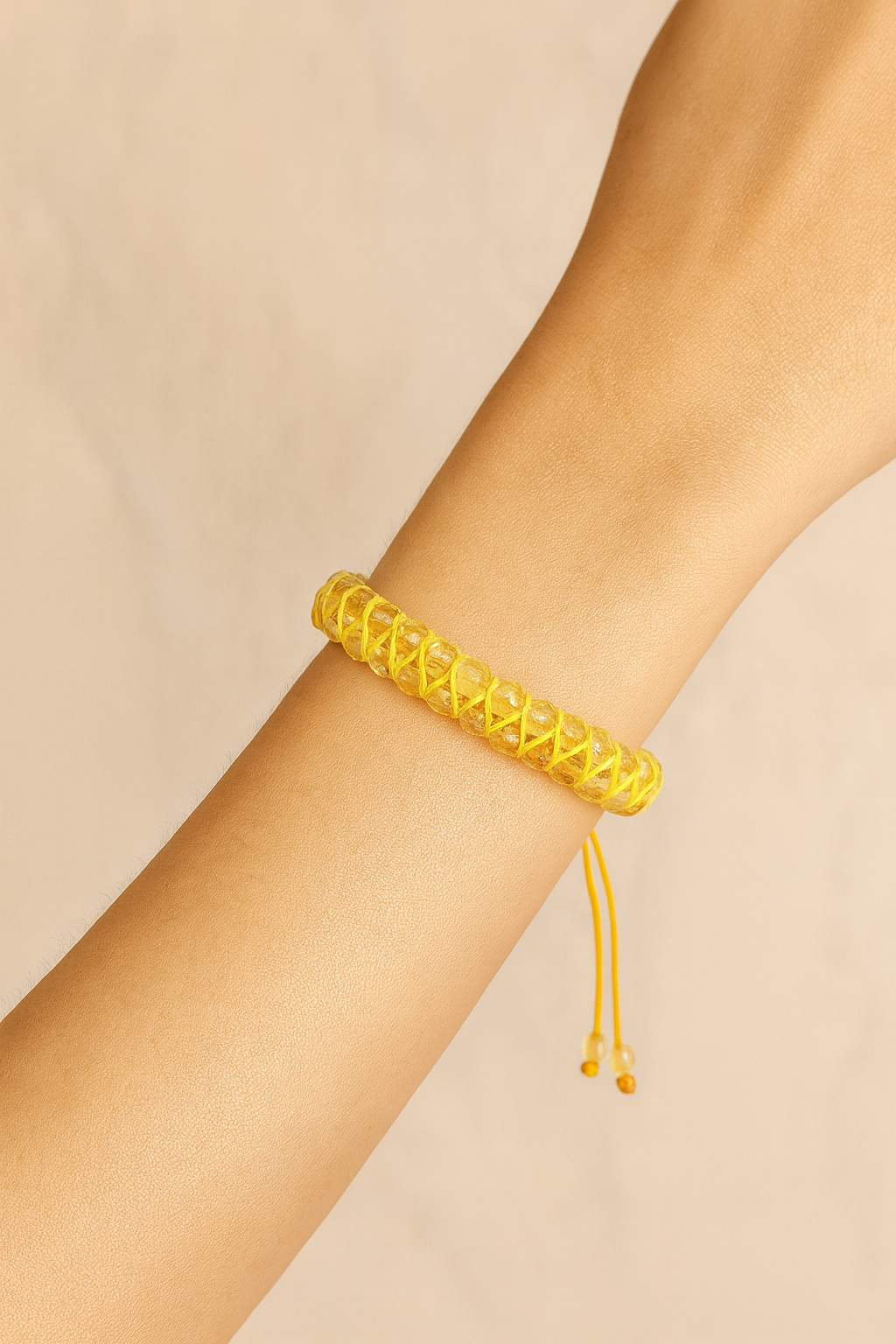 Canlı sarı tonlarıyla dikkat çeken %100 doğal sitrin taşları, özenle seçilerek 4 mm boyutunda işlenmiş ve çift sıra dizilimle modern bir makrome bileklik tasarımına dönüştürülmüştür.