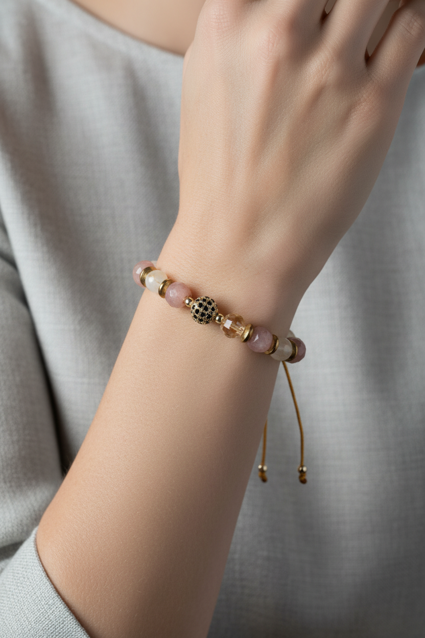 Sitrin taşının bal sarısı ışıltısı ile güneş taşının altın ve turuncu yansımaları bu bileklikte buluşarak güçlü ve enerjik bir uyum oluşturuyor. Doğal taşların canlı renkleri, günlük kombinlerde sade bir şıklık, özel günlerde ise sofistike bir tamamlayıcı görünüm kazandırıyor.