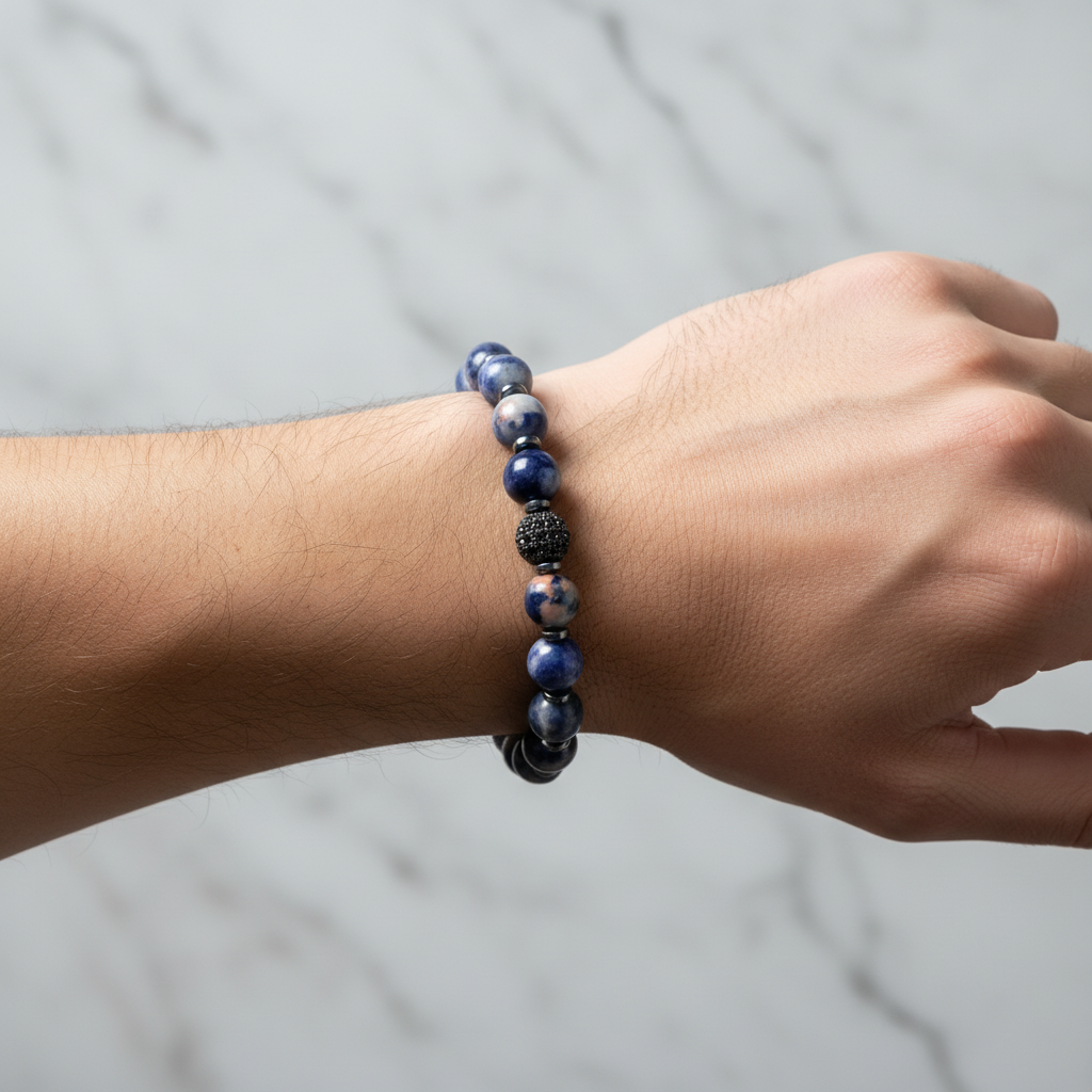 Sodalit ve hematit taşlarının uyumuyla tasarlanan bu doğal taş bileklik, zirkon aparat detayıyla modern ve zarif bir görünüm kazanır. El işçiliğiyle özenle hazırlanmış tasarım, günlük kullanımda ve özel günlerde stilinizi tamamlayan estetik bir aksesuardır.