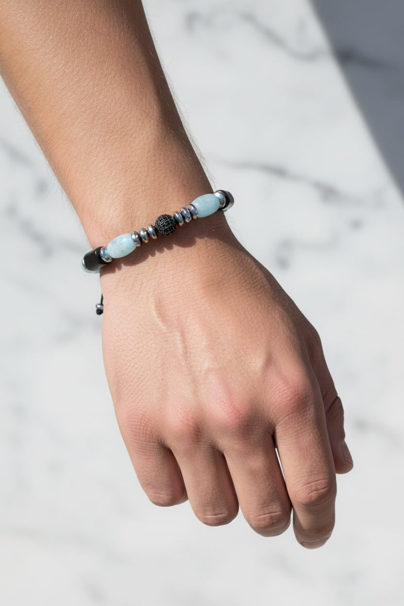 Şungitin asaleti, akuamarinin ferahlatıcı tonları ve hematitin güçlü parlaklığını bir araya getiren bu bileklik; koleksiyonuna modern ve sofistike bir parça eklemek isteyenler için ideal seçimdir.