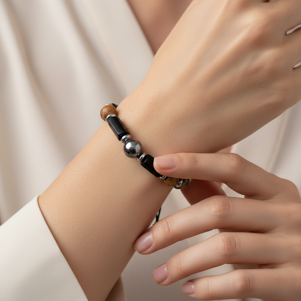 Şungit, jasper ve hematit taşlarının uyumuyla tasarlanan bu doğal taş makrome bileklik, modern ve güçlü görünümüyle öne çıkar. El işçiliğiyle özenle örülen dayanıklı makrome örgü, uzun süreli kullanım ve konfor sağlar.