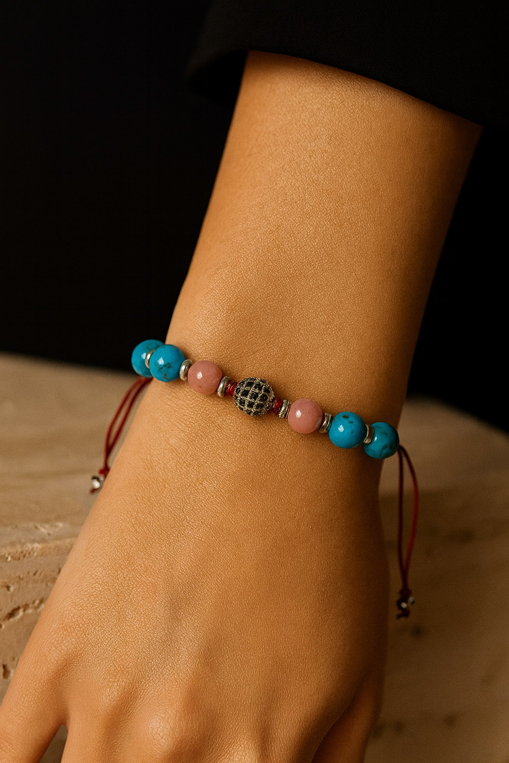Turkuaz ve rodokrosit taşlarının uyumlu birleşiminden oluşan bu makrome bileklik, modern tasarımı ve el işçiliğiyle öne çıkar. Dayanıklı makrome örgü tekniğiyle hazırlanan tasarım, uzun süreli kullanım için idealdir.