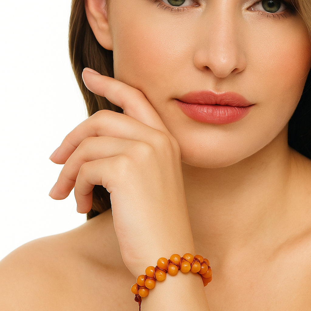Sıcak turuncu, kayısı ve tarçın tonlarıyla enerjik bir görünüm sunan turuncu aventurin taşı, bu özel bileklikte 8 mm yuvarlak kesim formunda dizilmiş ve çift sıra el yapımı makrome örgü ile tamamlanmıştır. Yüzeyindeki doğal ışıltı ve dengeli dizilim, bilekte canlı ve dengeli bir duruş sağlar.