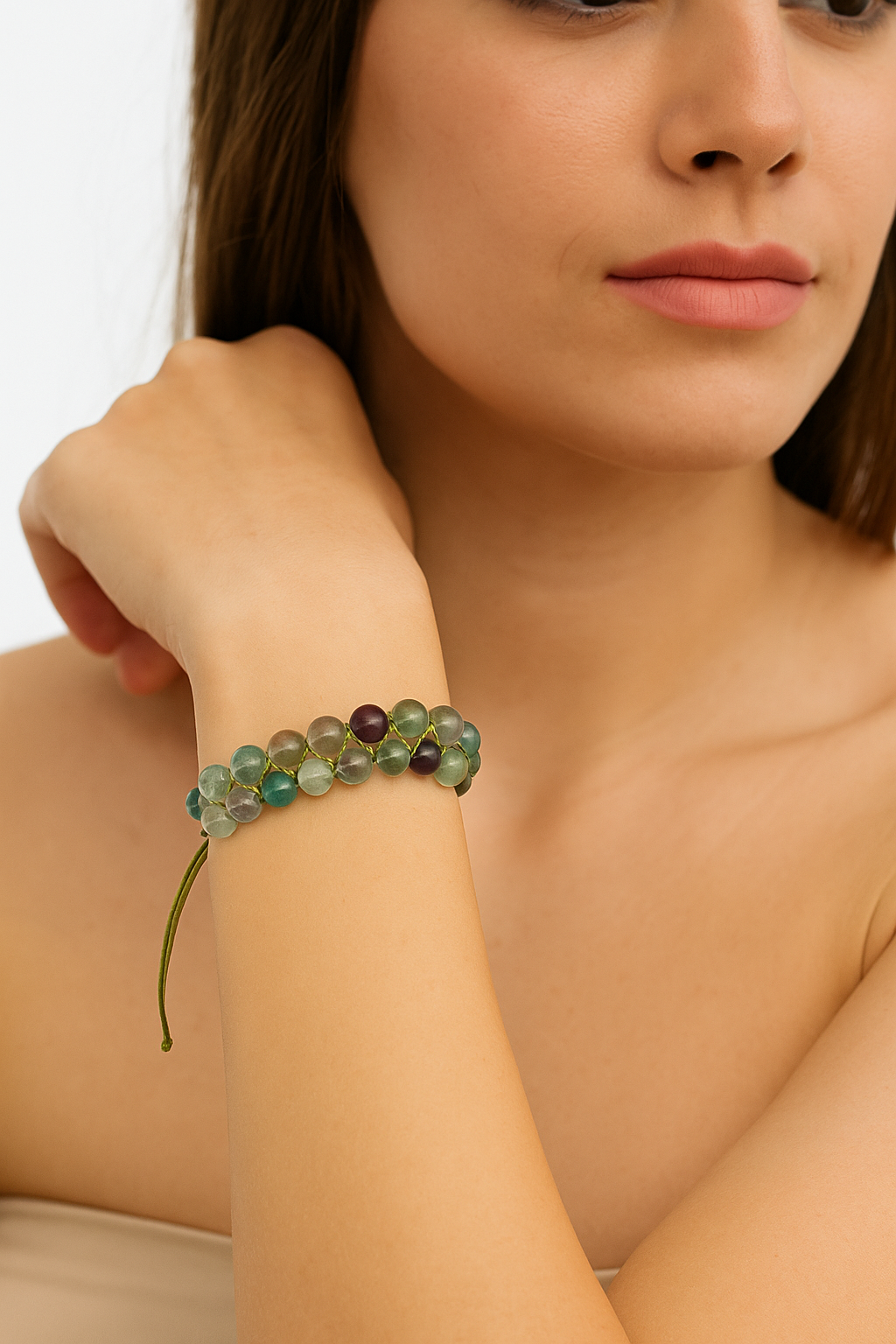 Yarı saydam yapısı ve yumuşak yeşil tonlarıyla bilinen yeşil florit taşı, bu özel bileklikte 8 mm yuvarlak kesim formuyla hazırlanmış ve çift sıra el yapımı makrome örgü ile tamamlanmıştır. Dengeli dizilimi ve doğal ışıltısıyla bilekte sade ama etkileyici bir duruş sunar.