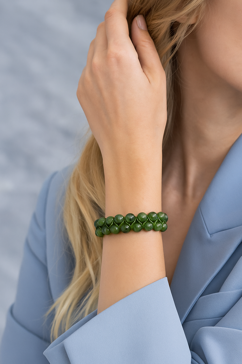 Serpantin türü yeşim taşı, doğadaki mineral zenginliğiyle dikkat çeker. Renk geçişleri ve doğal matlığı sayesinde her bileklik özgün bir görünüm taşır. Çift sıra yapısı, bu doğallığı daha hacimli ve kararlı bir stille buluşturur.