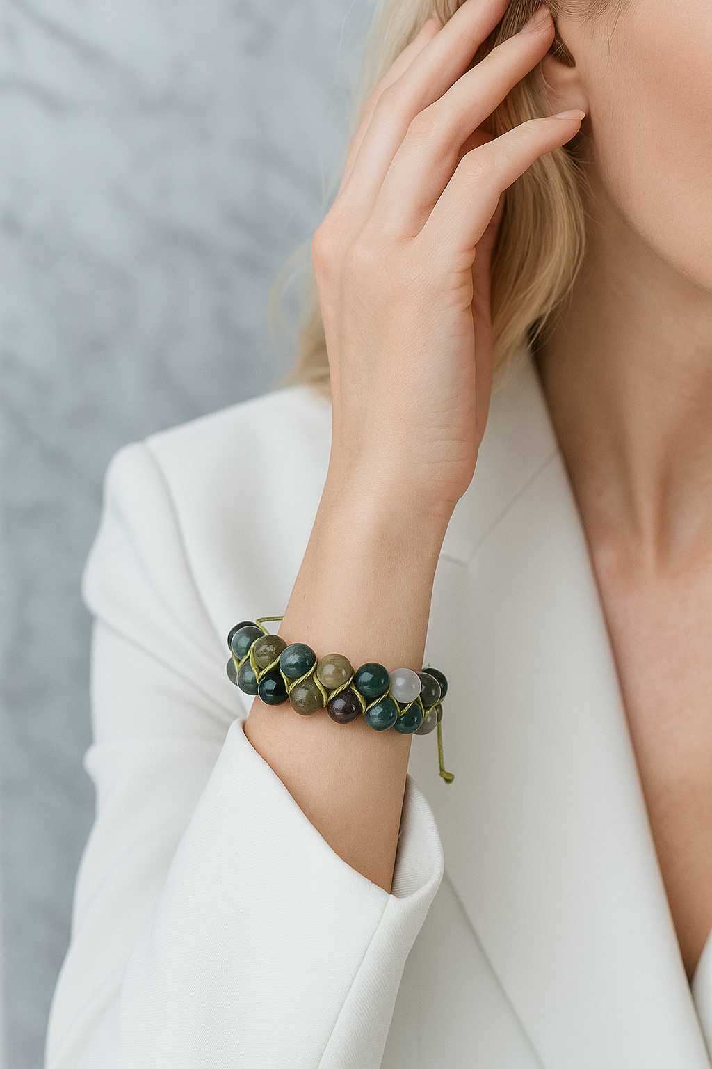 Yeşilin sayısız tonunu yarı saydam açık zeminle buluşturan ve içerisinde doğal yosun görünümlü desenler taşıyan yosun akik taşı, bu özel bileklikte 8 mm doğal taşlarla çift sıra dizilmiş ve ayarlanabilir makrome örgü tekniğiyle tamamlanmıştır. Taşların her biri doğada eşsiz bir iz gibi, bilekte benzersiz ve doğayla bütünleşen bir stil sunar.