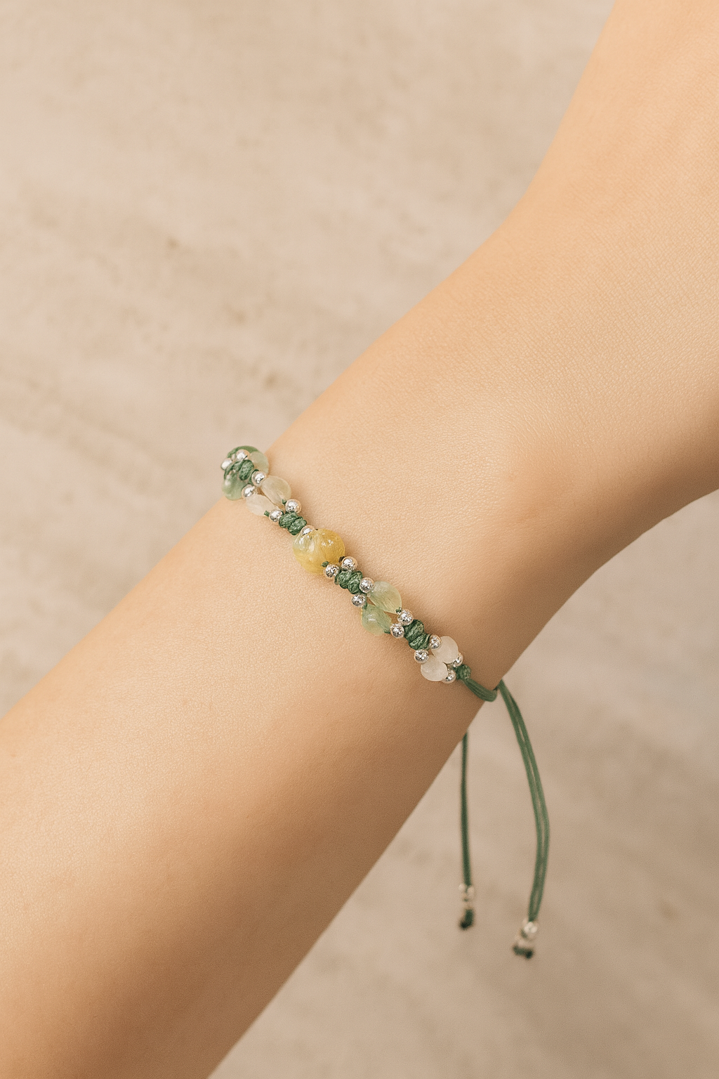 Sitrin’in sıcak altın tonları, Prehnit’in yumuşak yeşil dokusu ve Ay Taşı’nın doğal ışıltısı bu özel makrome bileklikte zarif bir denge oluşturur. El işçiliğiyle hazırlanan dayanıklı makrome örgüsü, hem konforlu kullanım hem de uzun ömürlü dayanıklılık sağlar. Ayarlanabilir yapısı sayesinde her bileğe kolayca uyum sağlar. Üç farklı doğal taşın estetik birleşimiyle tasarlanan bu bileklik, sade ama etkileyici bir stil sunar.