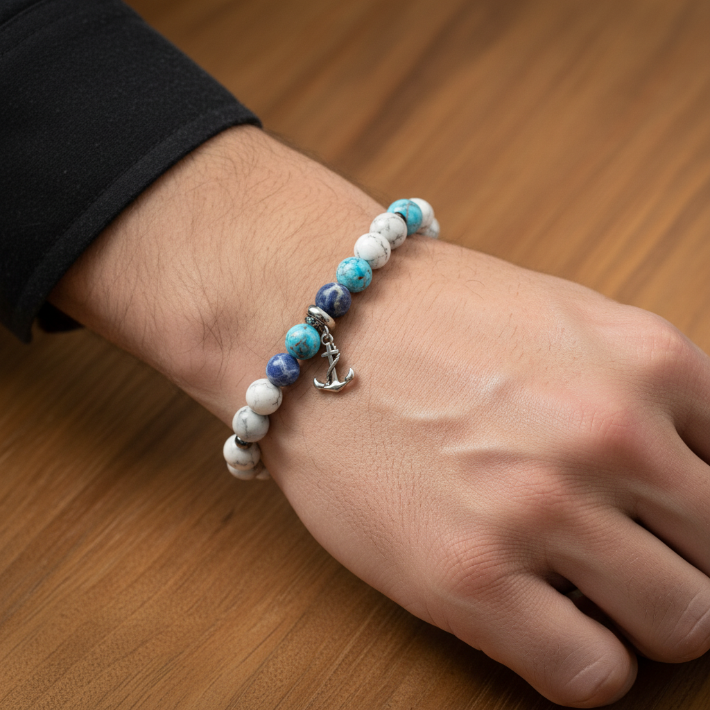 Sodalitin koyu mavi tonları, buz mavi apatitin ferahlatıcı ışıltısı, havlitin beyaz damarlı dokusu ve hematitin metalik parlaklığı bir araya gelerek modern bir erkek bileklik tasarımı oluşturuyor. El işçiliğiyle hazırlanan bu özel bileklik, maskülen tarzı şık detaylarla buluşturur. Günlük kullanımda güçlü bir stil sunarken, özel davetlerde de sofistike bir tamamlayıcıdır.