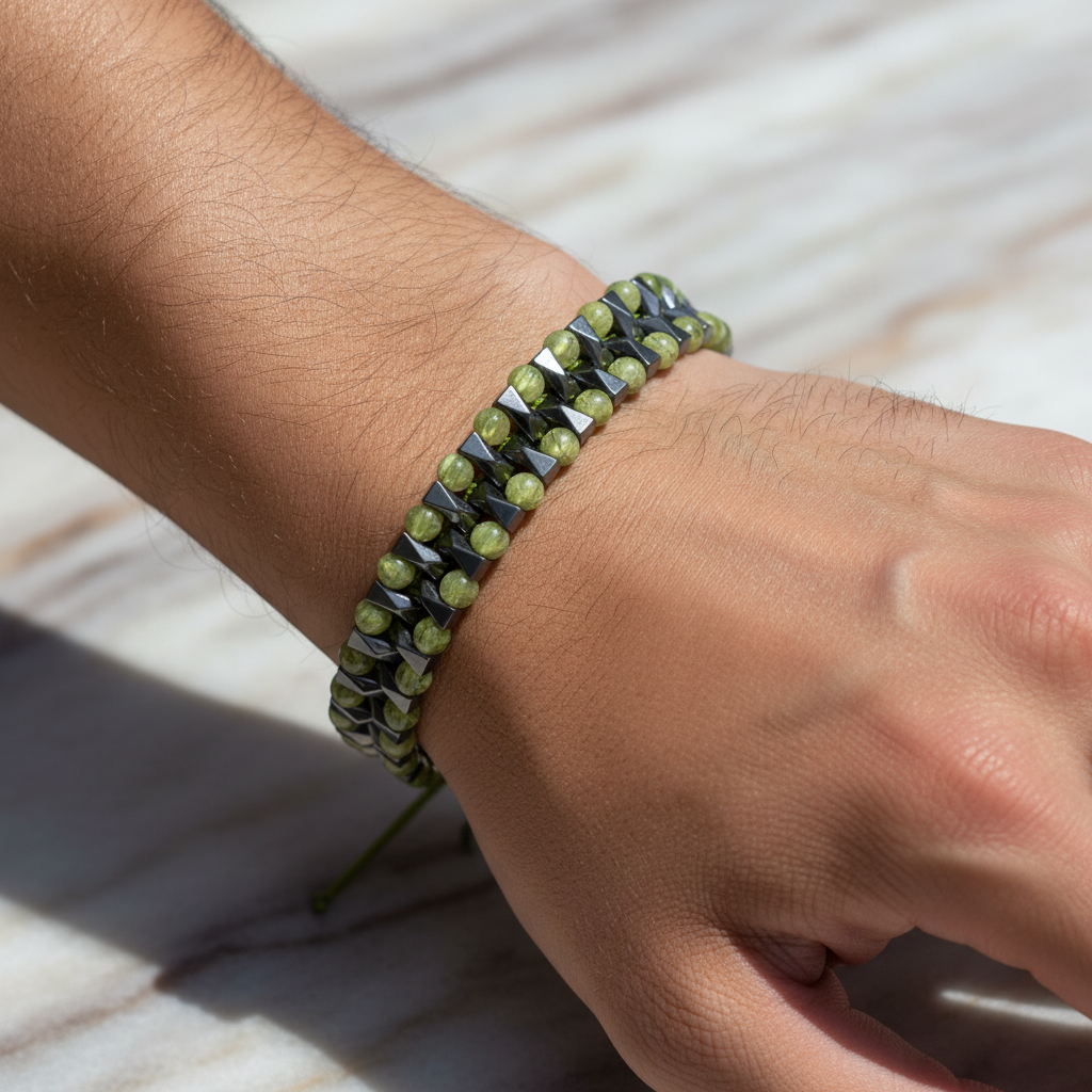 Doğal taşların özgün uyumunu yansıtan bu özel tasarım bileklikte, zebercetin canlı yeşil tonları hematitin metalik parlaklığıyla birleşiyor. Makrome örgü tekniğiyle el işçiliği olarak hazırlanan bu bileklik, maskülen tarzı modern çizgilerle buluşturuyor. Günlük kullanımda dayanıklılığıyla öne çıkan tasarım, özel günlerde de şık bir stil tamamlayıcısıdır.