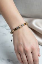 Kaplan gözünün enerjisini, sitrinin sıcak parlaklığını ve hematitin güçlü ışıltısını buluşturan bu 8 mm ipli ayarlanabilir bileklik; koleksiyonuna modern, zarif ve karakterli bir parça eklemek isteyenler için ideal seçimdir.
