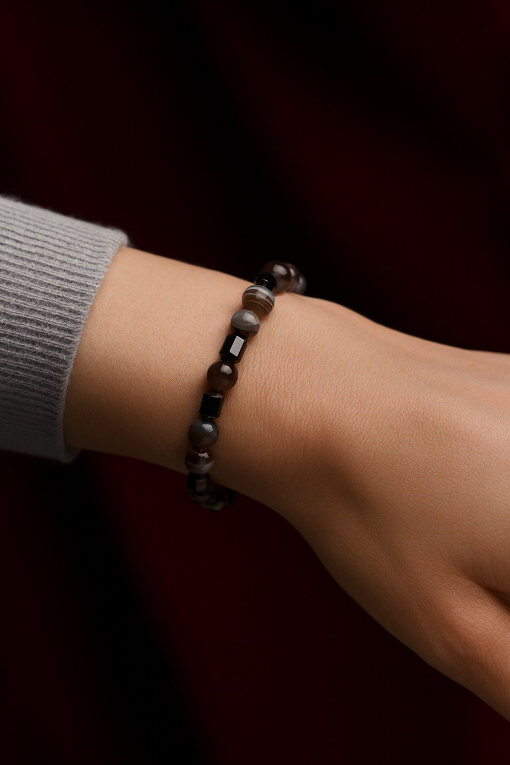 Pirtash ile akik taşının doğal zarafetini ve hematitin modern şıklığını bilimsel güvenceyle bileğinizde taşıyın.