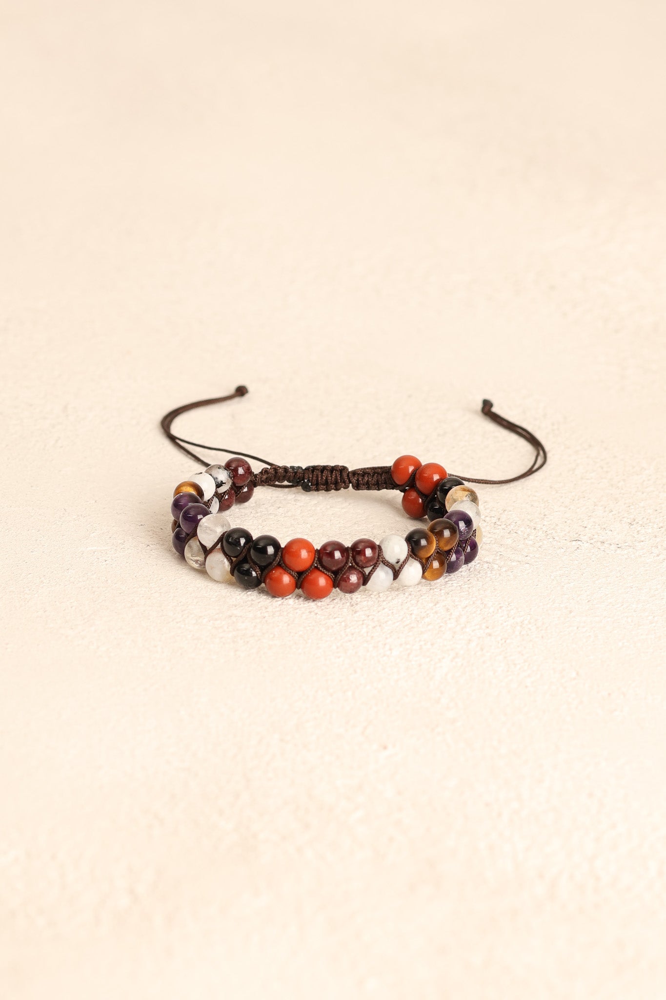Pirtash ile Akrep burcuna özel seçilmiş doğal taşların güçlü uyumunu, çift sıra makrome tasarım ve bilimsel güvenceyle bileğinizde taşıyın.
