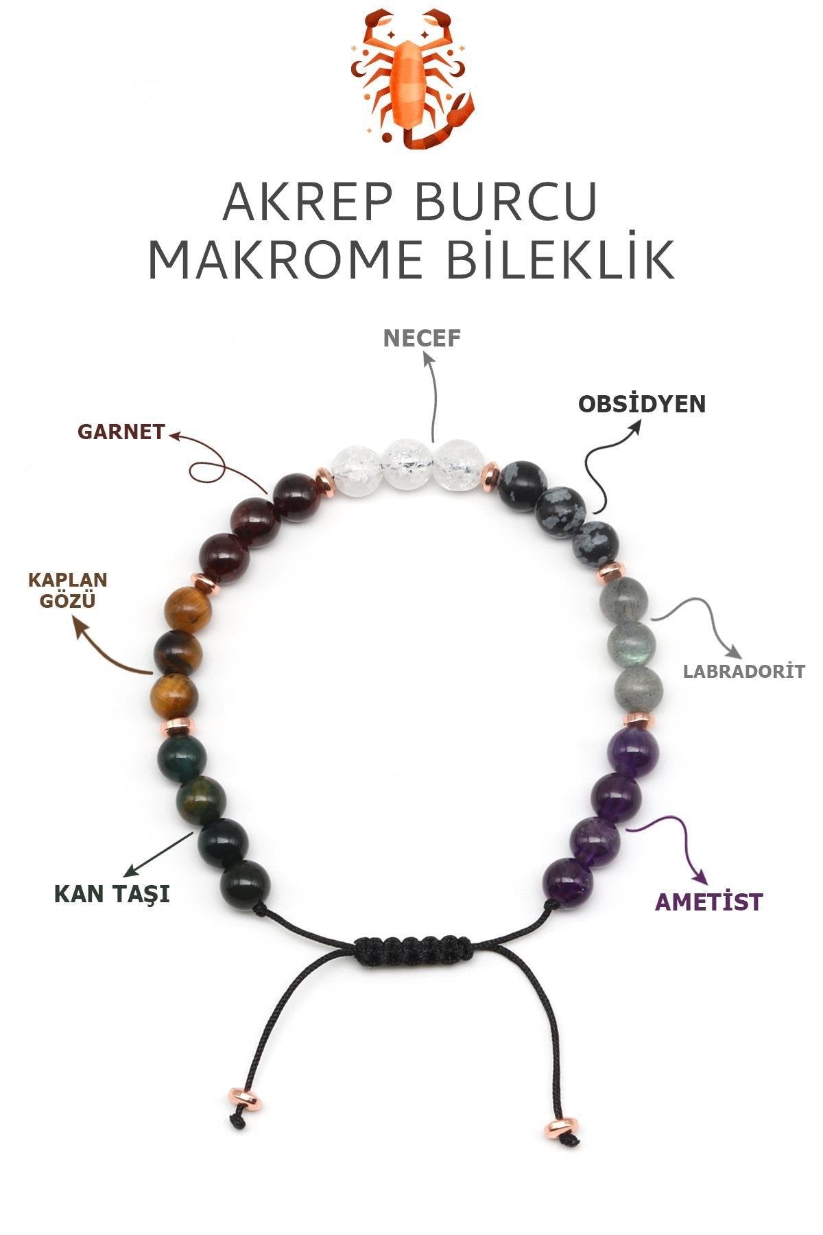 Tutkulu, kararlı ve sezgileri güçlü Akrep burcuna özel olarak tasarlanan bu makrome bileklik; garnet, necef, obsidyen, labradorit, ametist, kan taşı ve kaplan gözü gibi karakterli taşlardan özenle oluşturulmuştur. Her taş, Akrep burcunun derinliğini ve güçlü iç dünyasını simgelerken, bileklikteki simetrik dizilim bu enerjiyi dengeleyici bir forma taşır.