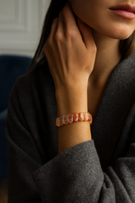 Berrak kuvars kristali içerisinde doğal olarak oluşmuş altın renkli iğnemsi rutil lifleriyle tanınan altın rutilli kuvars taşı, bu özel bileklikte 9 x 14 mm ölçülerinde özel kesim ve geniş formda tasarlanmıştır. Her taşın iç yapısında farklı yoğunlukta görülen altın rutil damarlar, bilekte göz alıcı ve sofistike bir duruş sergiler.