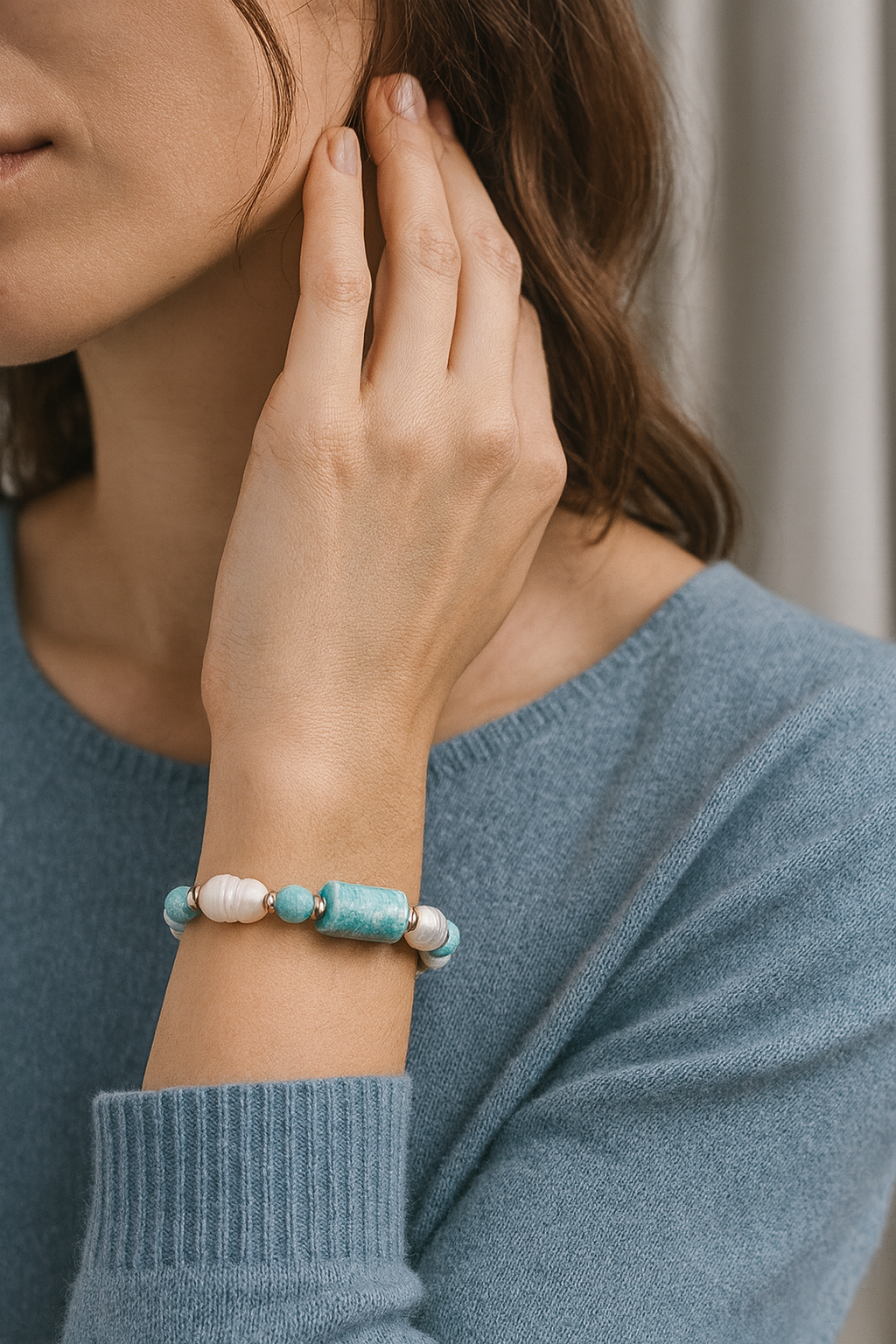 Amazonit taşı deniz köpüğü tonlarıyla huzur ve ferahlık hissi verirken, doğal inci asaleti simgeler. Hematit ise metalik gri parlaklığıyla tasarıma modern ve dengeli bir dokunuş kazandırır.