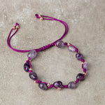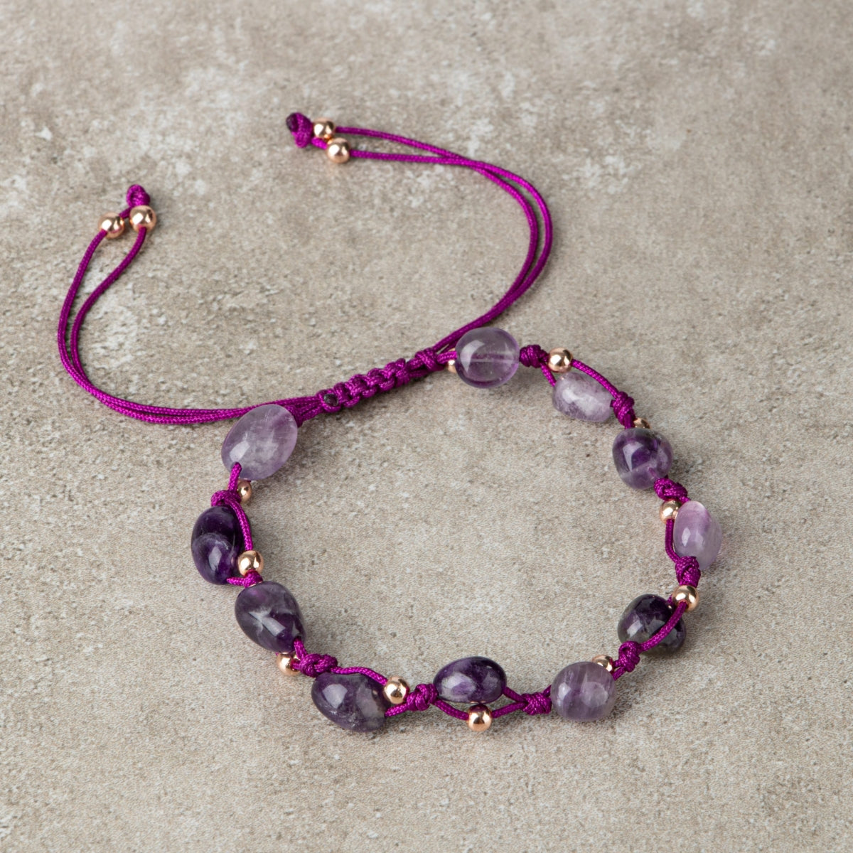 Zengin mor tonları, yarı saydam kristal yapısı ve doğal ışıltısıyla tanınan ametist taşı, bu özel bileklikte natürel kesimiyleyani ham formuna yakın yüzeyiyle sunulmuştur. Her bir taş, doğadaki özgün formunu koruyarak el yapımı ayarlanabilir makrome örgüyle bir araya getirilmiştir.