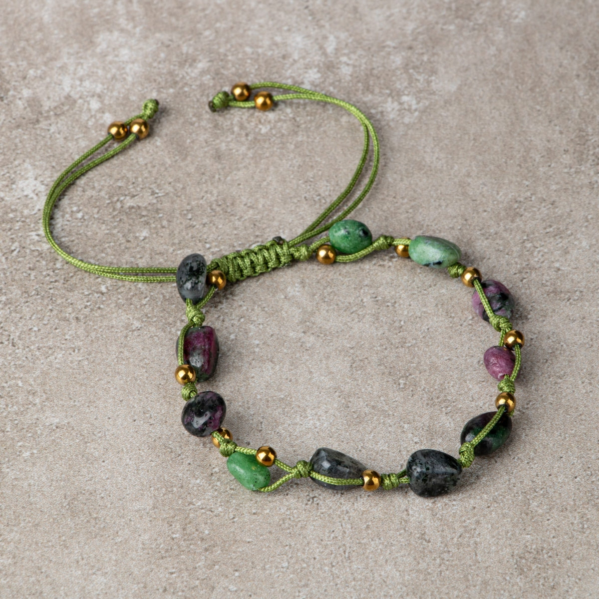 Zümrüt yeşili zoisit taşı içinde doğal olarak yer alan kırmızı rubin kristalleriyle oluşan anyolite (anyolite) taşı, bu özel bileklikte natürel kesimiyle (ham formuna yakın) sunulmuştur. Her taş, özgün yapısı korunarak el yapımı ayarlanabilir makrome örgüyle zarif ve dikkat çekici bir tasarıma dönüştürülmüştür.