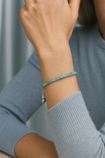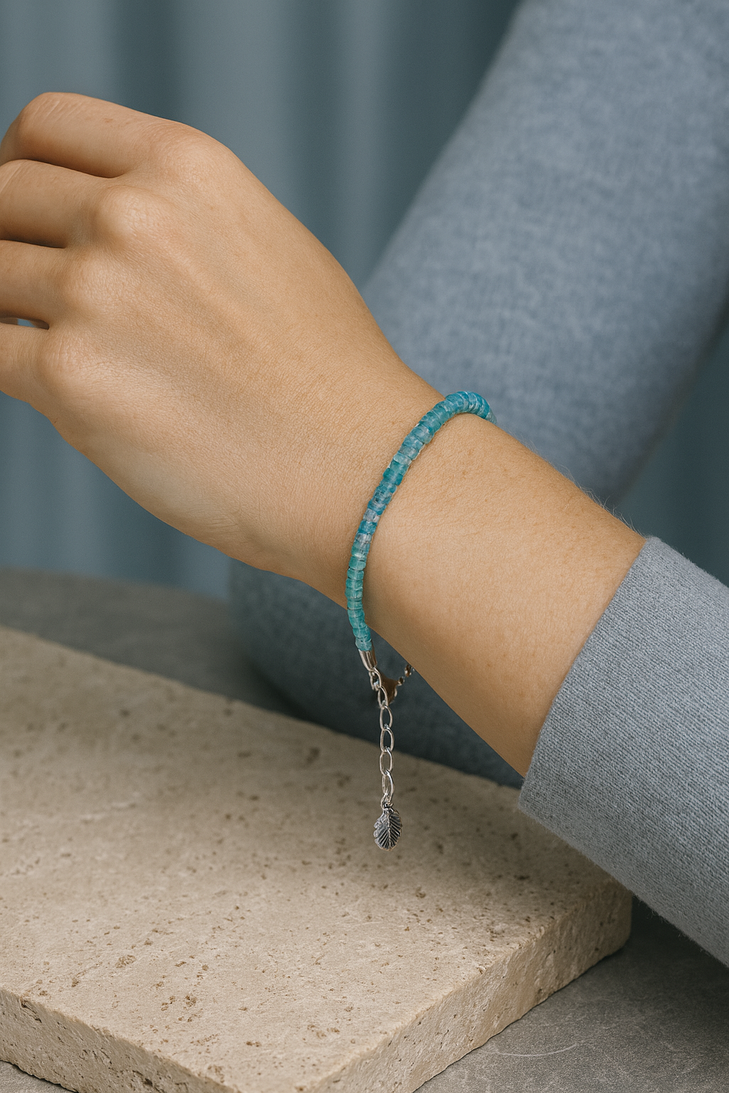 Kullanılan apatit taşları %100 doğaldır ve her biri kendine özgü renk geçişleri ve parlaklığıyla her bilekliği benzersiz kılar.
